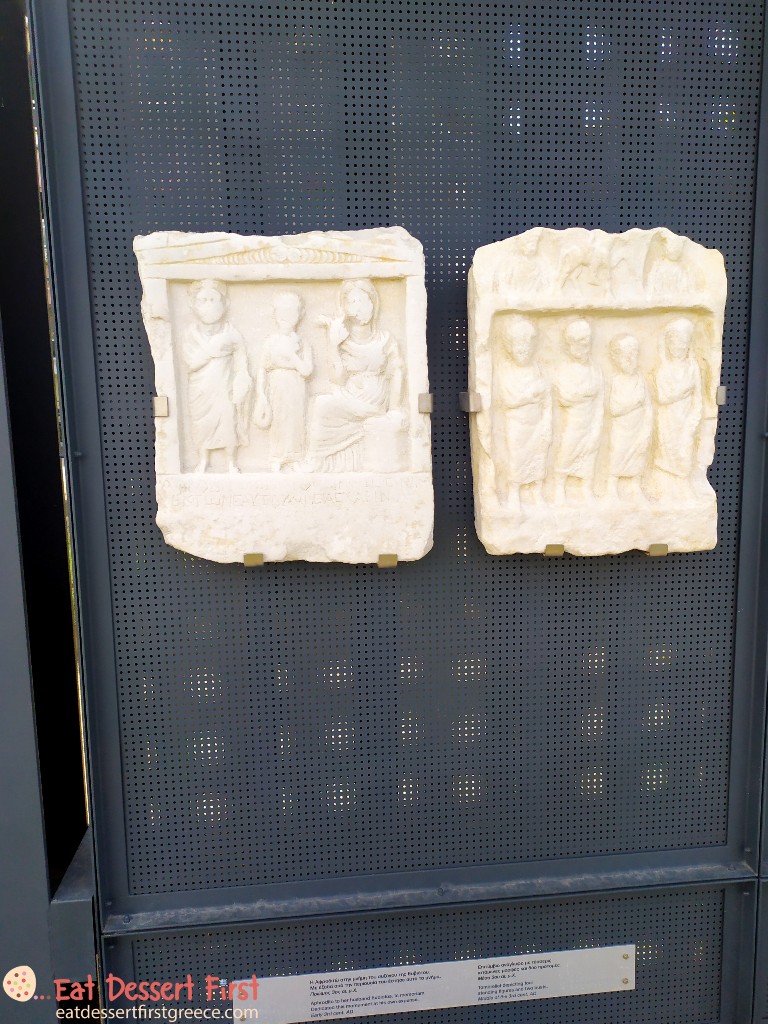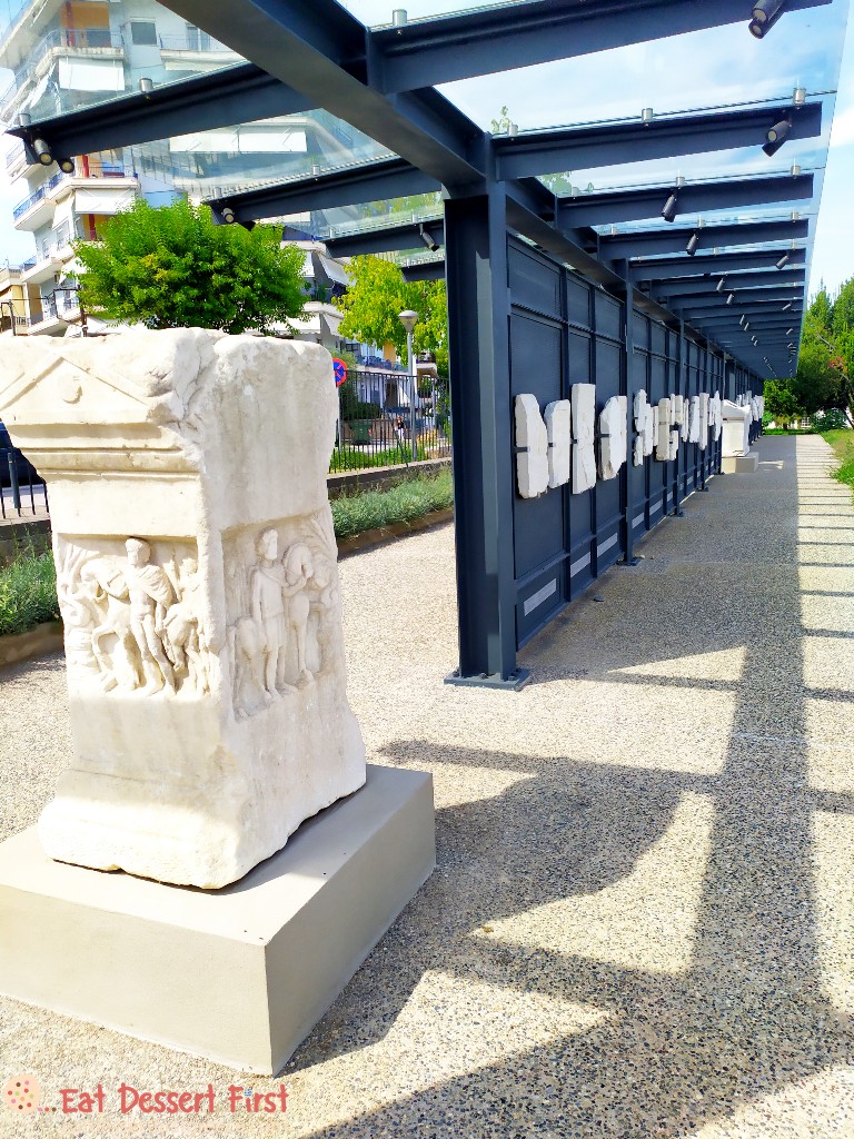 Walking to the Archaeological Museum of Veria we passed a very interesting open-air exhibition, in the courtyard of the museum, free for the public. The exhibition was set up in June 2021 with findings from the area, we were later told at the Archaeological Museum. It is a “wall of memory”, as they used to have in the villages in the good hall of the house with souvenir photos, which in this case are tombstones dating from the 4th century BC until the 4th century AD, “Ancient photographs” carved in marble that tell the story of the people of Veria, men and women.