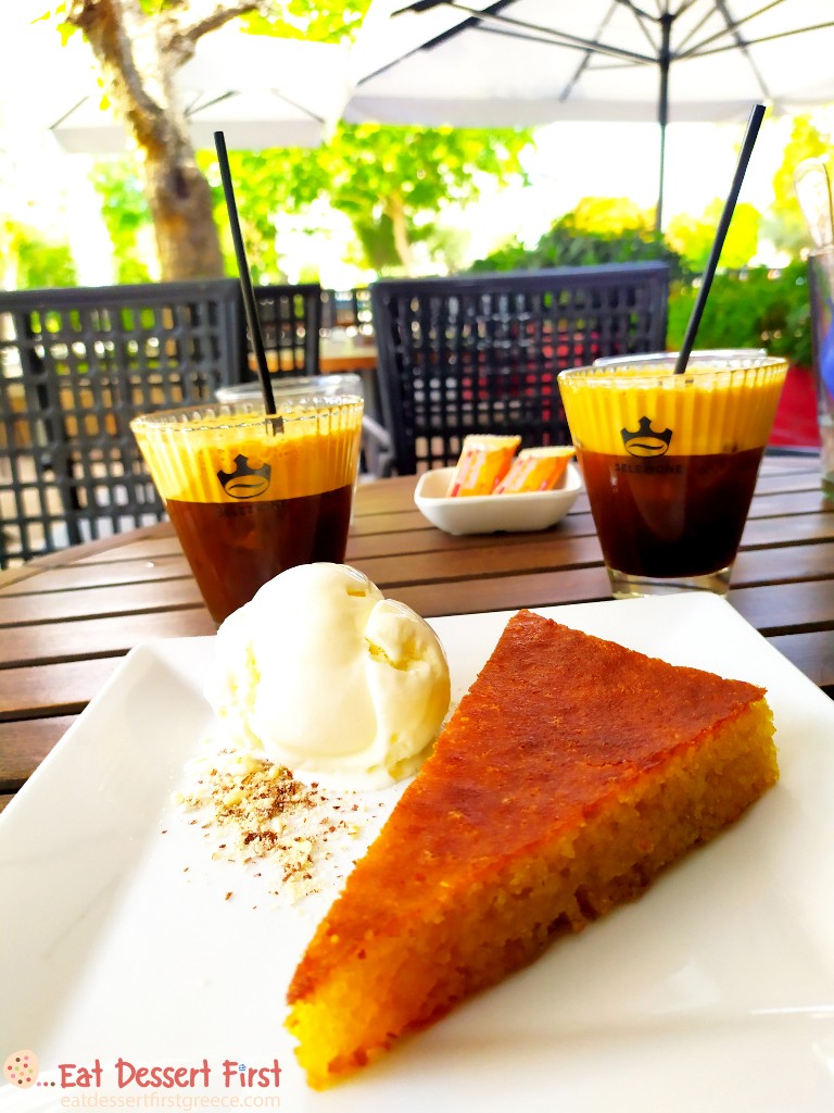 Handmade ravani with ice cream and cold coffees, since the day was warm and sunny