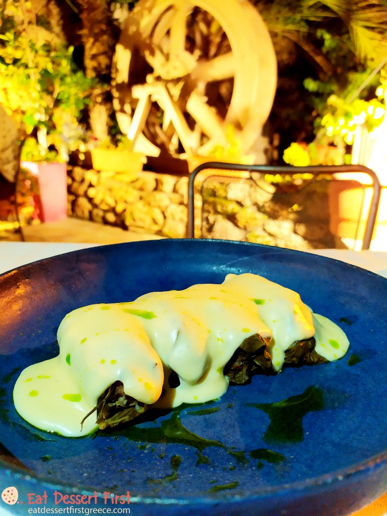 Giaprakia wrapped in vine leaves from Xinomavro of Naoussa with rice and minced meat, with egg-lemon cream and basil oil