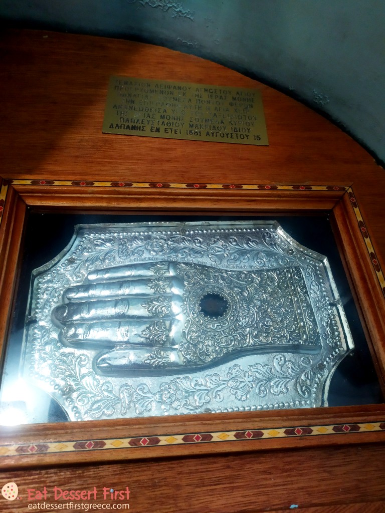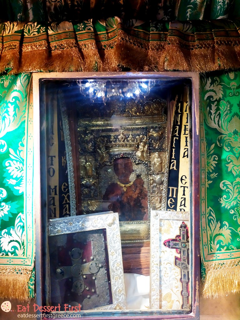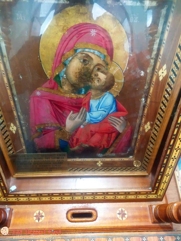 Inside the Holy Temple is kept a great icon, the history of which shocked us. This is the first image made by the Evangelist Luke of the Virgin Mary around the 1st century AD, a miraculous image engraved on wood, in which the signs of time are visible. Think how the Evangelist created the image having seen the Virgin Mary himself! It was a portable image, which he carried with him. In total, the Evangelist Luke painted 74 icons of the Virgin Mary, the people of the administration of the Pilgrimage told us, one of which, the one we have the great pleasure to see at the Pilgrimage of Kastania, together with two others were created while the Virgin Mary was alive.