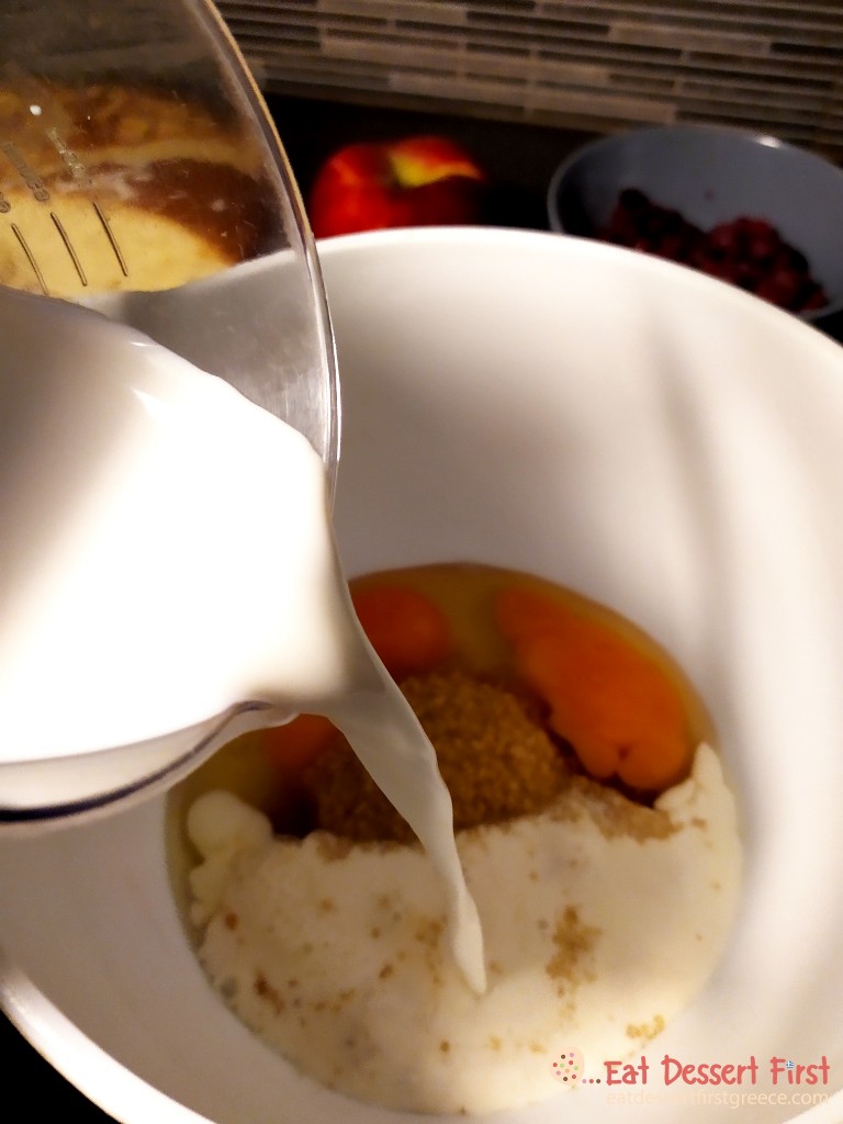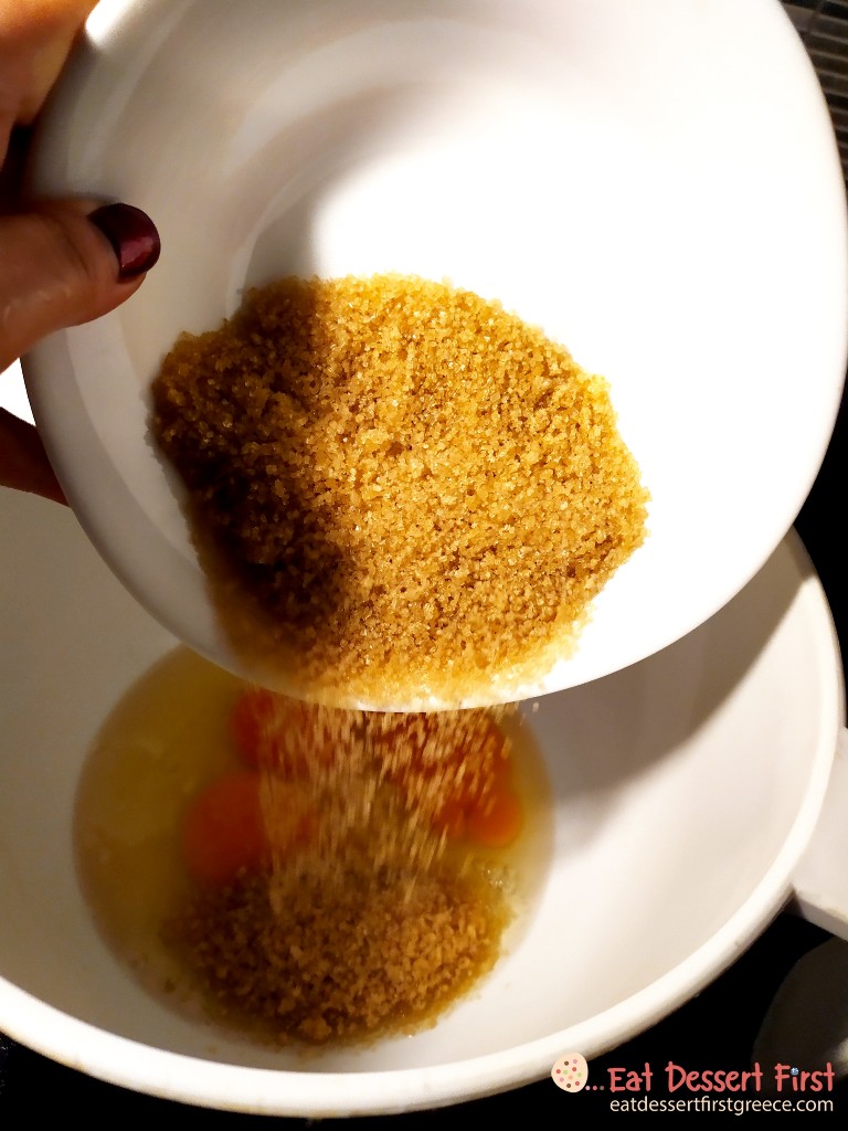 Σε ένα μεγάλο μπολ ρίχνουμε τα αυγά και τη μαύρη ζάχαρη. Προσθέτουμε το γάλα.