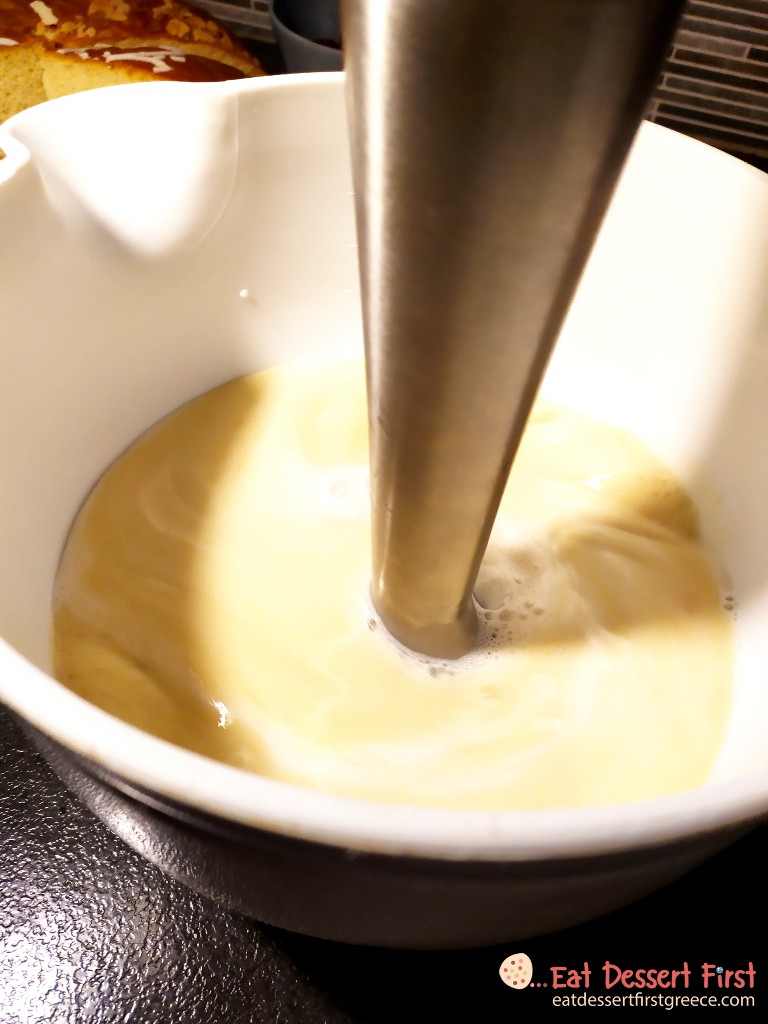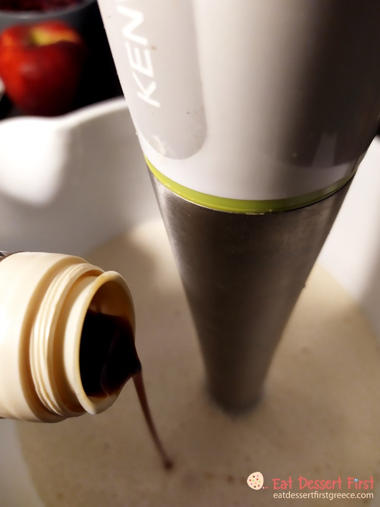 Ομογενοποιούμε καλά τα υλικά με ένα μπλέντερ χειρός ή με το χέρι με το σύρμα. Προσθέτουμε τη βανίλια.