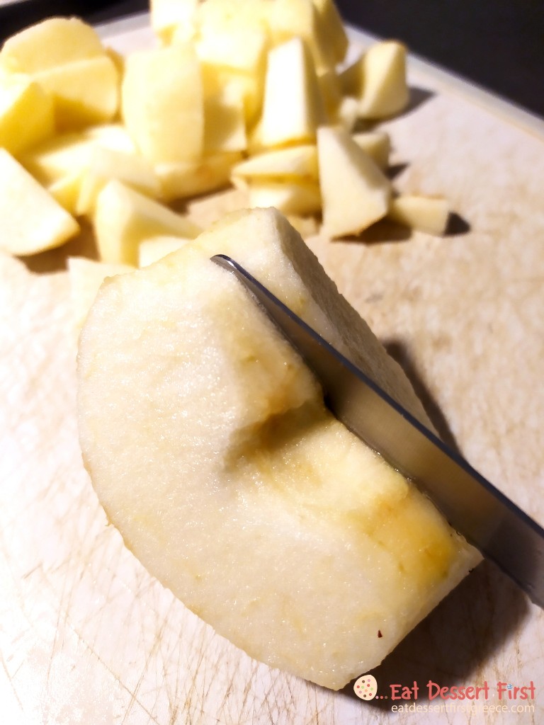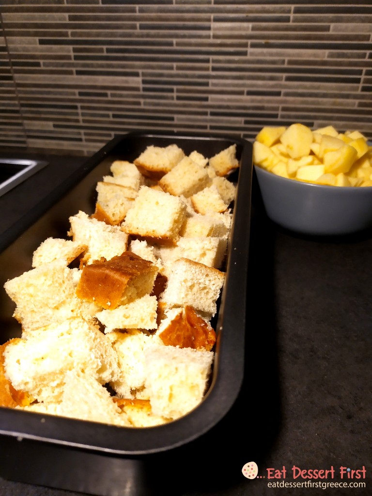 Κόβουμε το μήλο και τη βασιλόπιτα σε κυβακια.