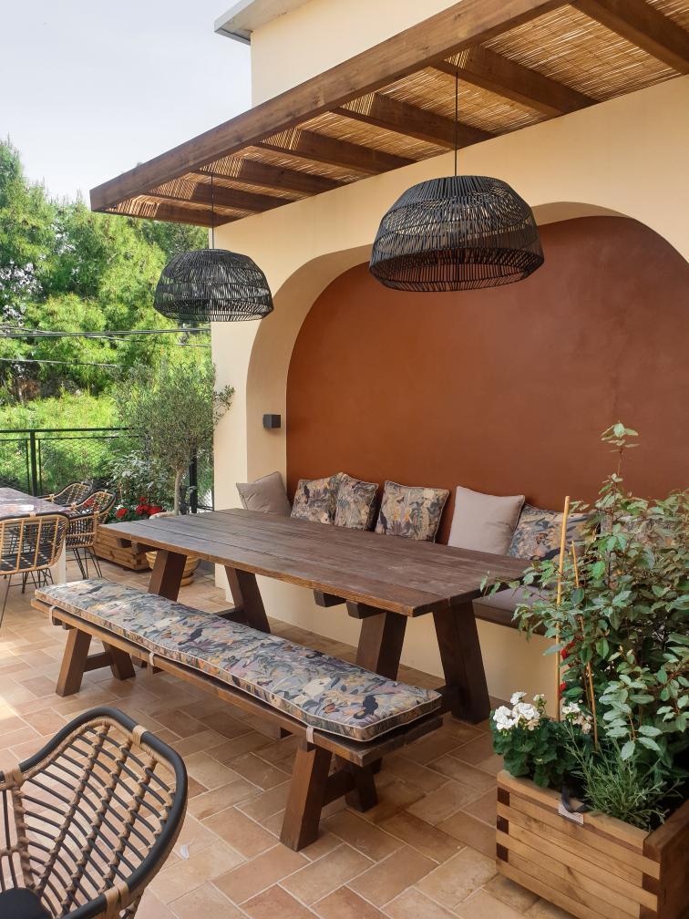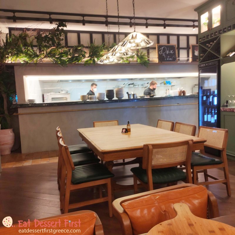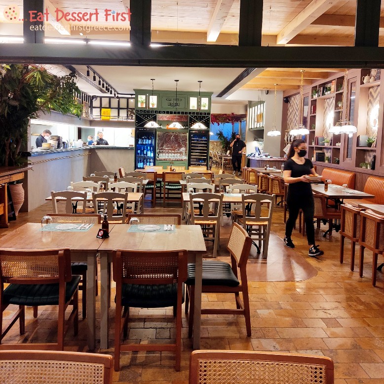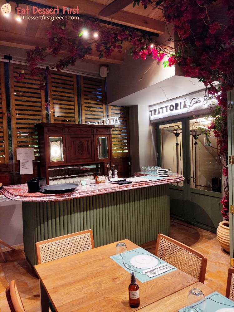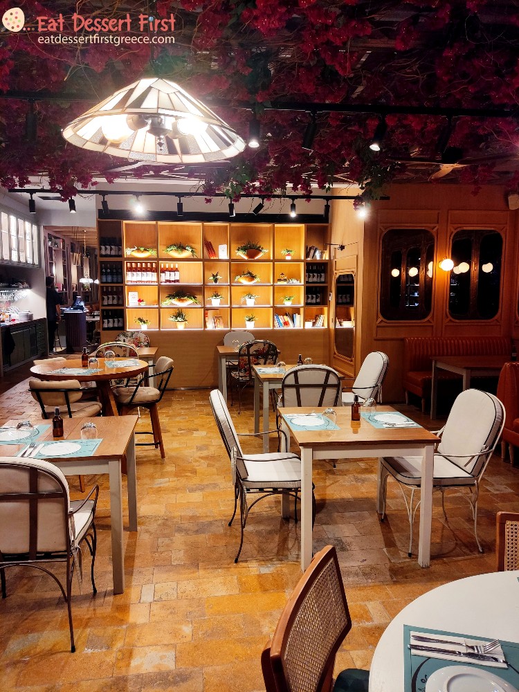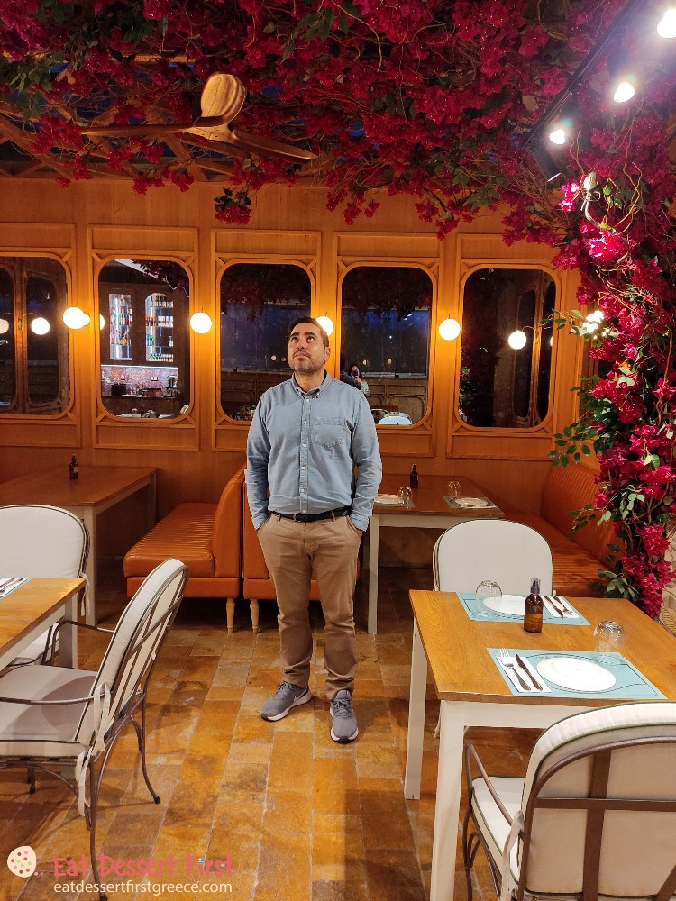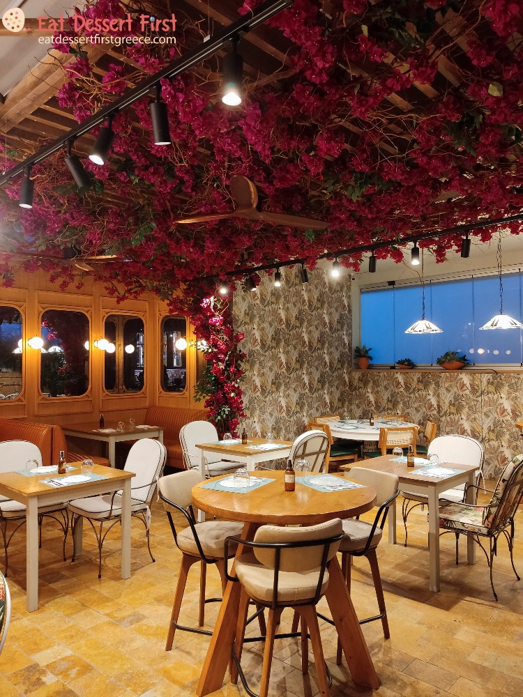 Ένα ακόμα πολύ ιδιαίτερο σημείο του μαγαζιού είναι η πίσω αίθουσα με την ξύλινη οροφή με τις φούξια βουκαμβίλιες. Οι βουκαμβίλιες είναι τα αγαπημένα μας λουλούδια και πραγματικά ξετρελαθήκαμε με αυτόν τον χώρο. Τον έχουν διαμορφώσει με τέτοιο τρόπο ώστε ενώ είναι εσωτερικός, να νιώθεις λες και κάθεσαι έξω ένα καλοκαιρινό βραδάκι, μια υπέροχη αίσθηση!