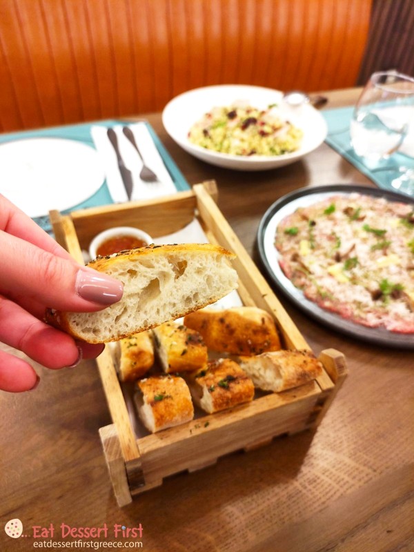 Αφού κάναμε την πρώτη μας περιήγηση στο εστιατόριο, ο πολύ ευγενικός και φιλικός υπεύθυνος της Trattoria Casa Bianca Δημήτρης Τζώρτζης μας πρότεινε να καθίσουμε σε έναν από τους αναπαυτικούς καναπέδες τους μπροστά από τις βιβλιοθήκες με τα βιβλία και τα γλαστράκια που δημιουργούν μια πολύ ζεστή ατμόσφαιρα. Εκεί ξεκινήσαμε μια πολύ ενδιαφέρουσα κουβέντα για όλα όσα θέλαμε να μάθουμε για την επιχείρηση στην οποία βρισκόμασταν και το φαγητό που θα δοκιμάζαμε.