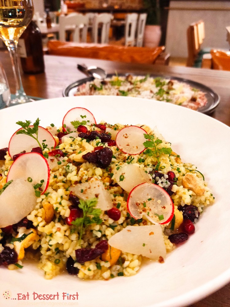 Το μενού της Trattoria Casa Bianca αλλάζει ανά περιόδους σε ένα ποσοστό 30%. Ένα σημαντικό κριτήριο είναι η εποχικότητα των προϊόντων που υπάρχουν διαθέσιμα. Ένα παράδειγμα που μας ανέφερε ο Δημήτρης είναι η σαλάτα Πλιγούρι/Αχλάδι -την δοκιμάσαμε και ήταν ειλικρινά φανταστική!- η οποία το καλοκαίρι γίνεται με αβοκάντο, ενώ τον χειμώνα με αχλάδι.