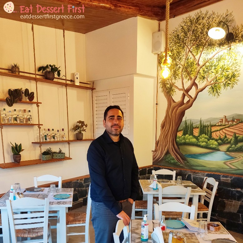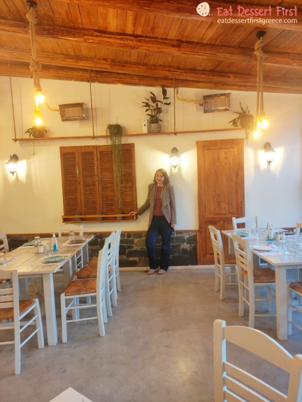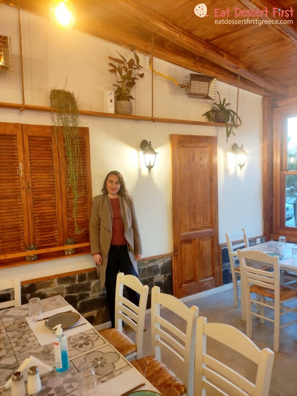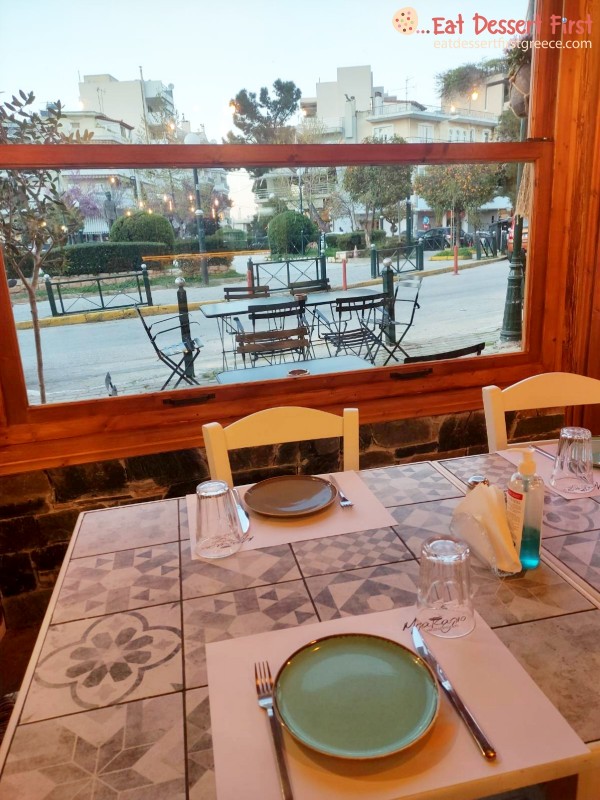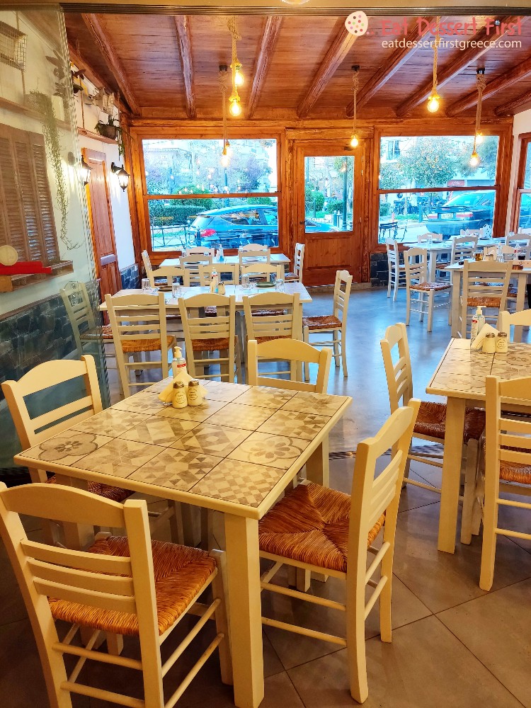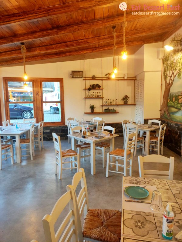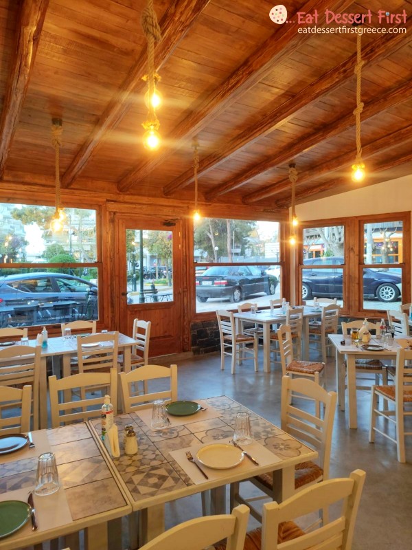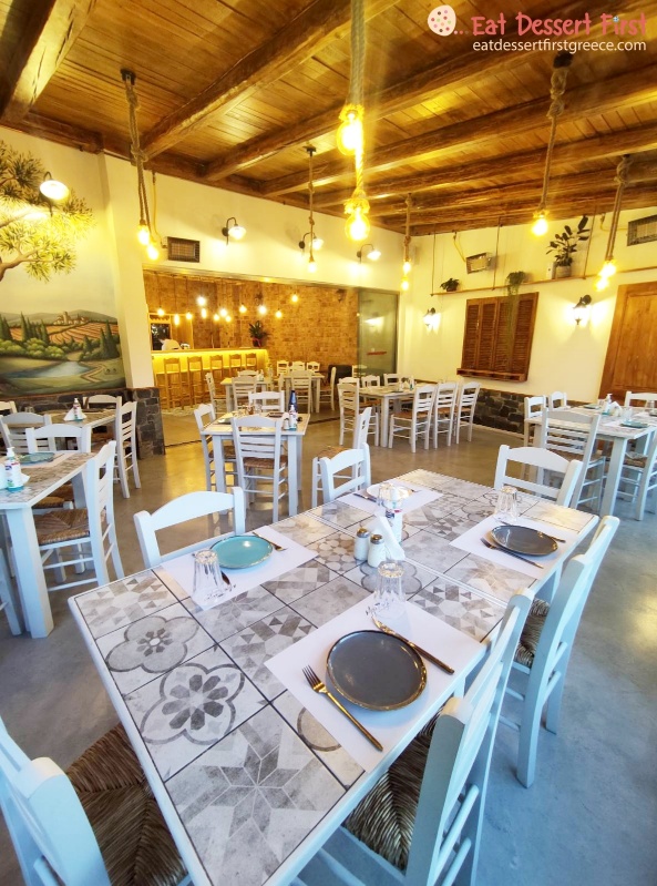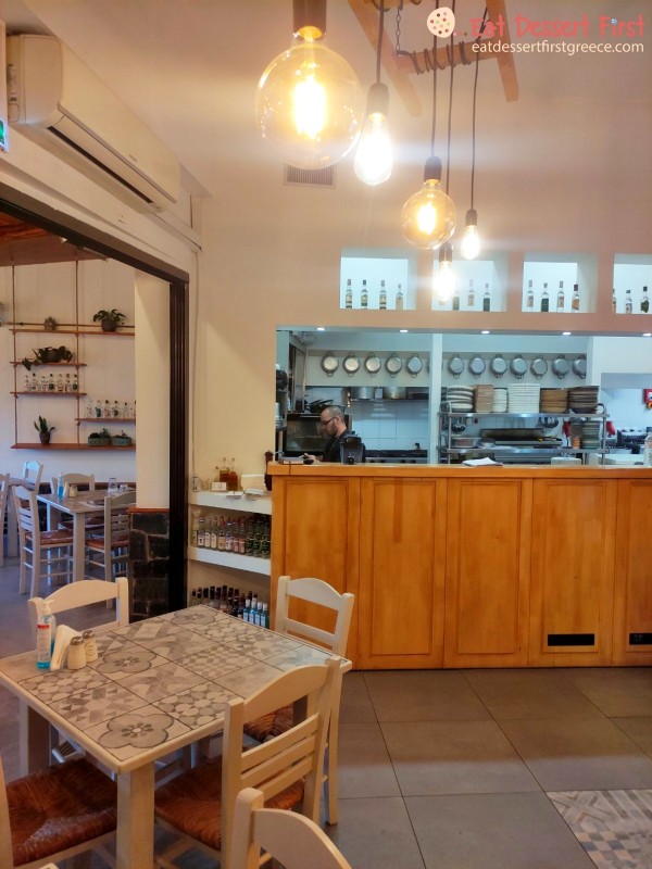 Μπαίνοντας στον εσωτερικό χώρο νιώσαμε αμέσως οικεία και άνετα. Η ξύλινη οροφή και τα ξύλινα παράθυρα, μαζί με τις ψάθινες καρέκλες δημιουργούσαν την αίσθηση ενός παραδοσιακού μεζεδοπωλείου, ενώ τα τραπέζια με τα πλακάκια σε γκρι αποχρώσεις προσέδιδαν μια σύγχρονη νότα. Τα φωτιστικά με σχοινί ταίριαζαν απόλυτα στον κομψό-ρουστίκ χαρακτήρα του χώρου, και μια τοιχογραφία με ένα τοπίο με μια ελιά σε ταξίδευε σε μέρη εξοχικά.