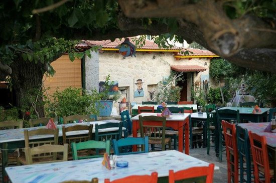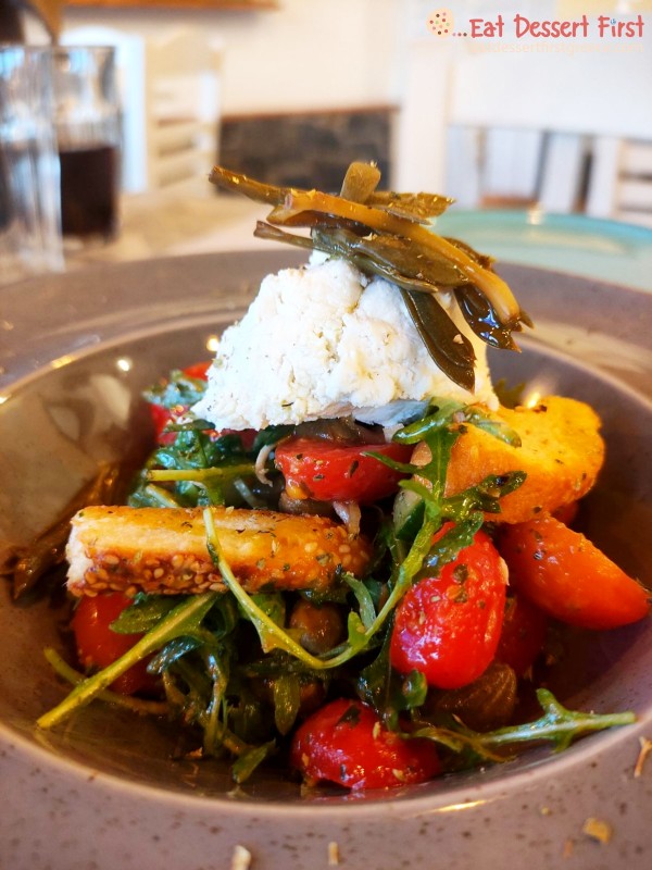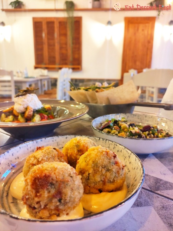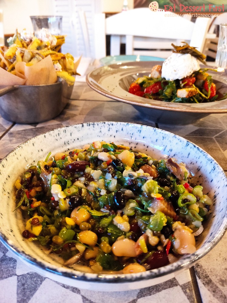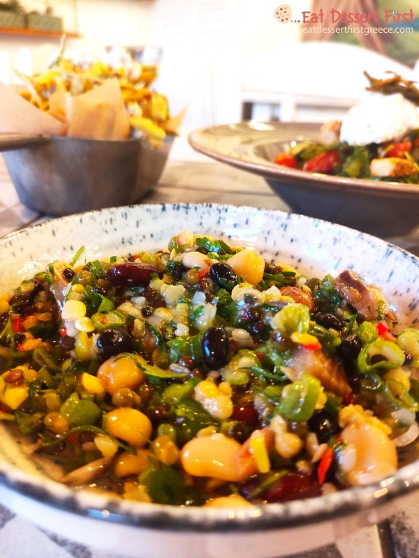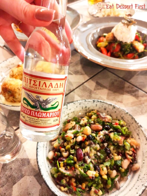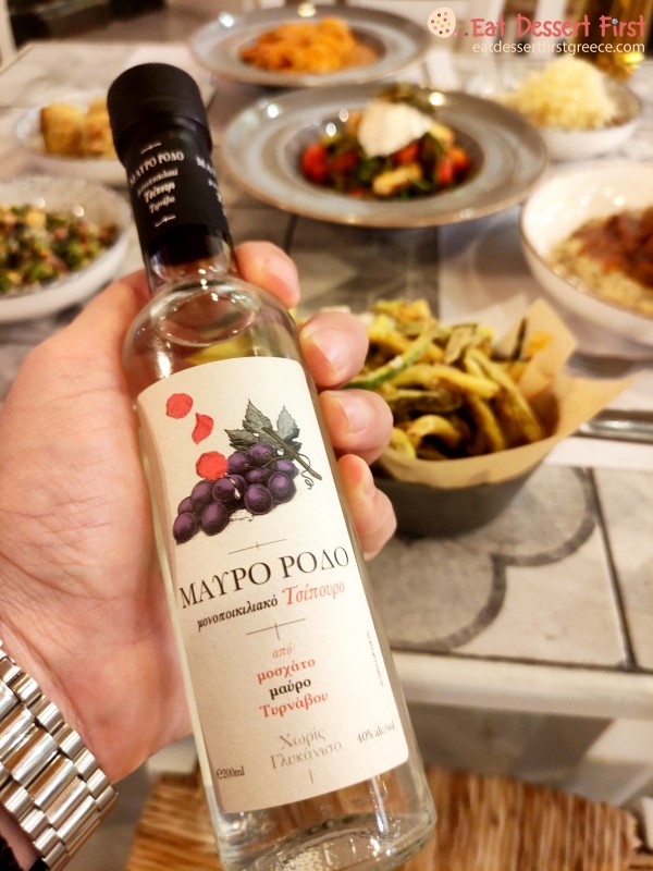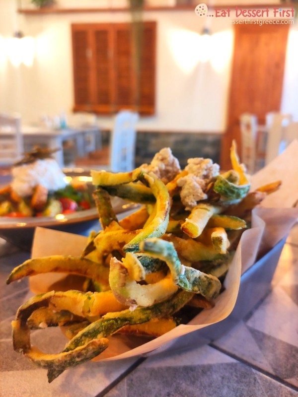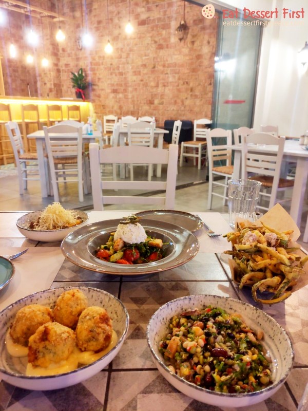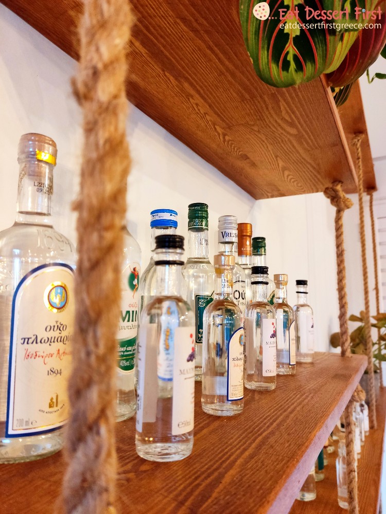 Μπαίνοντας στον εσωτερικό χώρο νιώσαμε αμέσως οικεία και άνετα. Η ξύλινη οροφή και τα ξύλινα παράθυρα, μαζί με τις ψάθινες καρέκλες δημιουργούσαν την αίσθηση ενός παραδοσιακού μεζεδοπωλείου, ενώ τα τραπέζια με τα πλακάκια σε γκρι αποχρώσεις προσέδιδαν μια σύγχρονη νότα. Τα φωτιστικά με σχοινί ταίριαζαν απόλυτα στον κομψό-ρουστίκ χαρακτήρα του χώρου, και μια τοιχογραφία με ένα τοπίο με μια ελιά σε ταξίδευε σε μέρη εξοχικά.