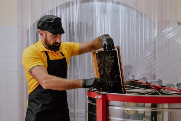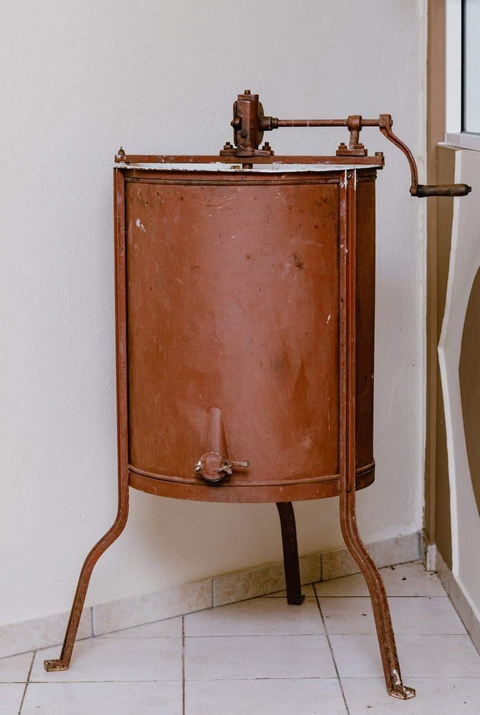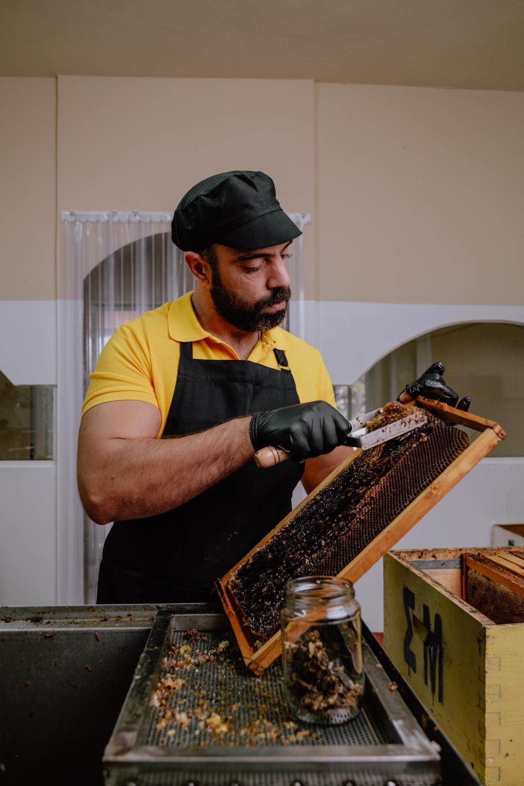 Η επεξεργασία του μελιού γίνεται με έναν σύγχρονο μελιτοεξαγωγέα. Σε αυτόν βάζουν αποκλειστικά τις κηρήθρες που είναι γεμάτες με μέλι και δεν έχουν επάνω τους γόνους, δηλαδή τα μωρά των μελισσών. Όπως μας είπε η Αθηνά, το έμπειρο μάτι των μελισσοκόμων ξέρει να τις ξεχωρίζει. Αφού βγει το μέλι από τις κηρήθρες μεταφέρεται στις δεξαμενές, όπου φυλάσσεται, χωρίς κάποια θερμική επεξεργασία. Για να συσκευαστεί έπειτα το μέλι είναι απαραίτητο να θερμανθεί στους 30-32°C, ώστε να αργήσει η διαδικασία της κρυστάλλωσης. Η θέρμανση πρέπει να δίνεται με μεγάλη προσοχή, διότι αν θερμανθεί περισσότερο κινδυνεύει να χάσει τα ποιοτικά του χαρακτηριστικά. Η κρυστάλλωση του μελιού οφείλεται στην υγρασία -οι μέλισσες στις κηρήθρες ακολουθούν μια πολύ συγκεκριμένη διαδικασία για να κρατήσουν το μέλι ρευστό, εξάγουν την υγρασία από την κυψέλη πριν τη σφραγίσουν με το κερί. Το κρυσταλλωμένο μέλι, βέβαια, σε καμία περίπτωση δεν έχει χαλάσει, αλλά μπορεί να επανέλθει αν θερμανθεί ελαφρώς σε ένα μπεν μαρί.