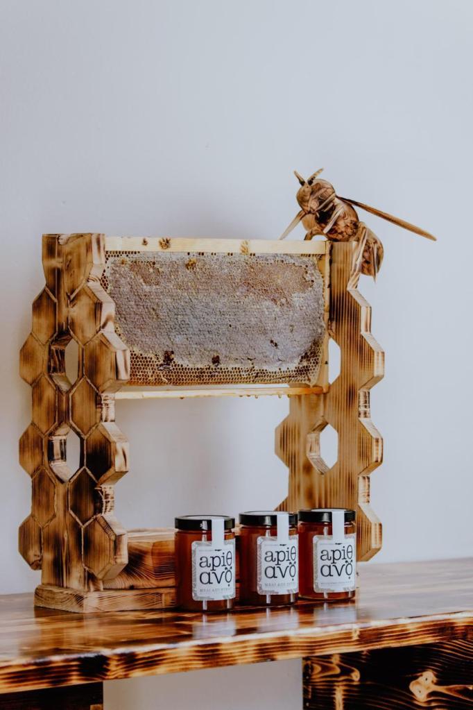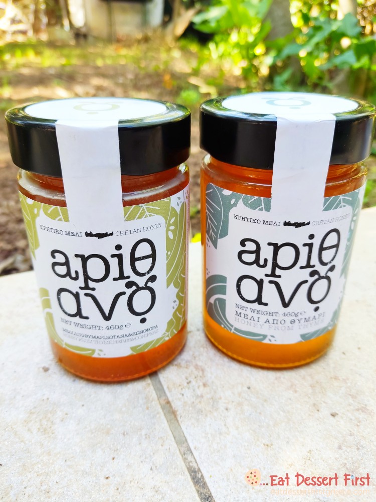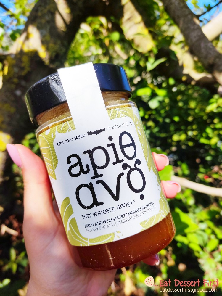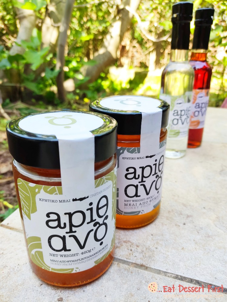 Πρώτα από όλα θέλαμε να γνωρίσουμε καλύτερα όλα τα προϊόντα της επιχείρησης. Το όνομα τους, το Apiθανο, προέρχεται από το πάντρεμα δύο λέξεων: το apis που σημαίνει μέλισσα στα λατινικά και το ελληνικό επίθετο απίθανο. Το βασικό τους προϊόν είναι το κρητικό μέλι. Το Apiθανο έχει τρεις βασικές ποικιλίες μελιού, τις πιο γνωστές στην Κρήτη: θυμαρίσιο μέλι, μέλι από θυμάρι, βότανα και κωνοφόρα (πευκοθύμαρο) και μέλι χαρουπιάς. Το μέλι χαρουπιάς είναι η μικρότερη ποικιλία τους και, όπως μας τόνισε η Αθηνά, δεν πρέπει να το συγχέουμε με το χαρουπόμελο -είναι μέλι που μαζεύουν οι μέλισσες από άγριες χαρουπιές στα τέλη του Σεπτεμβρίου, όταν ανθίζουν.