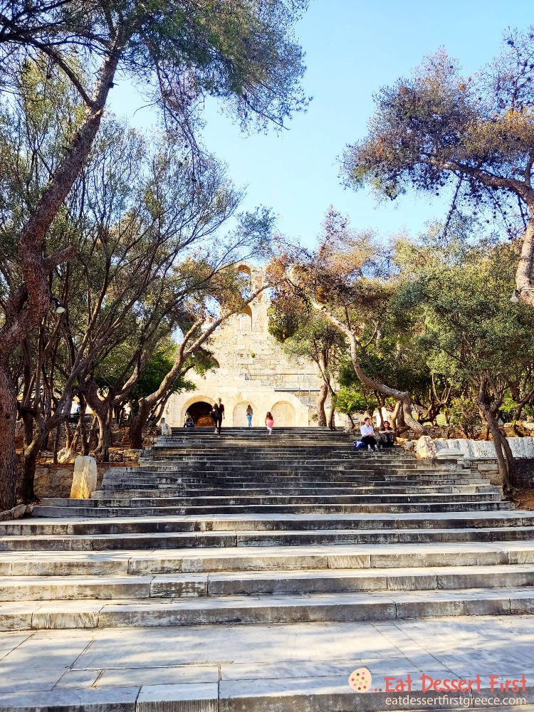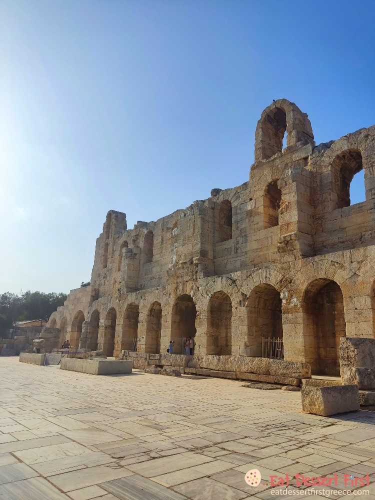 Και κάπως έτσι φτάσαμε στο Ηρώδειο ή αλλιώς Ωδείο Ηρώδου Αττικού, χτισμένο τον 2ο αιώνα μ.Χ. Όπως μάθαμε, από την αποκατάστασή του κατά τη δεκαετία του 1950 έχει φιλοξενήσει μουσικές παραστάσεις από σπουδαίους καλλιτέχνες, όπως η Μαρία Κάλλας, ο Frank Sinatra, η Νάνα Μούσχουρη, ο Luciano Pavarotti, o Vangelis, o Yianni, ο Μάριος Φραγκούλης, ο Elton John και άλλοι πολλοί. Σήμερα αποτελεί ένα πανέμορφο μνημείο της περιοχής, γύρω από το οποίο μπορούμε να περιηγηθούμε, να ρίξουμε ματιές μέσα, να καθίσουμε στα παγκάκια μπροστά του, να φωτογραφηθούμε. Και φυσικά μπορούμε να παρακολουθήσουμε κάποια από τις πολλές παραστάσεις που διοργανώνονται στο εσωτερικό του, το οποίο είναι πραγματικά μια φανταστική εμπειρία!