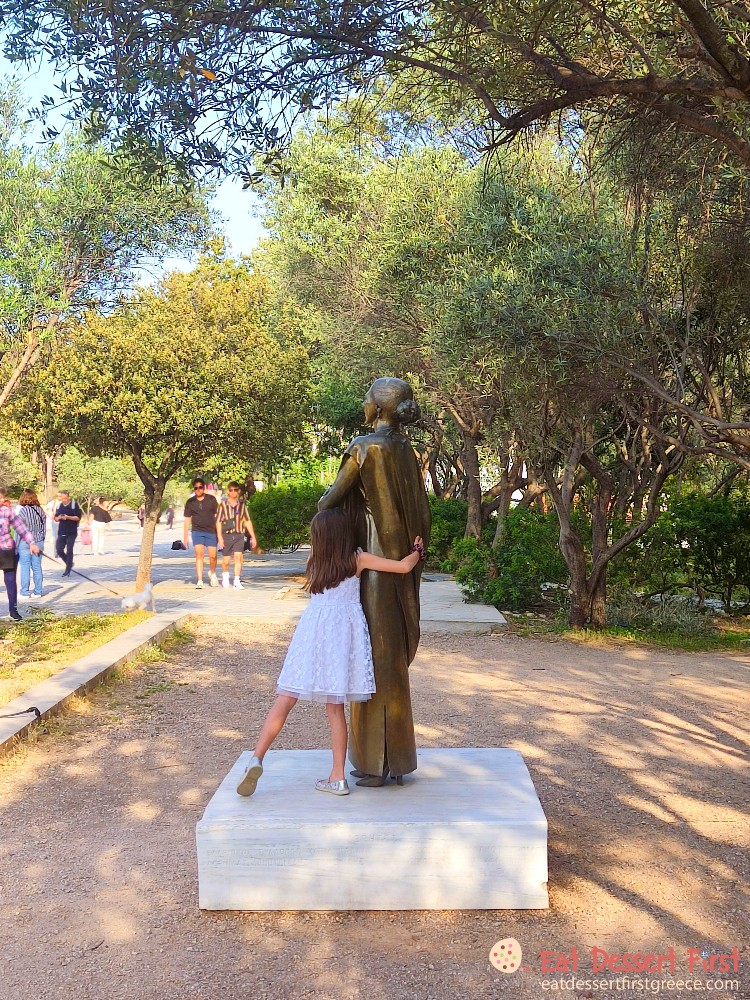 Για να κατέβουμε από τον λόφο ακολουθήσαμε μια διαφορετική πορεία, μια διαδρομή που είχε δημιουργήσει και διακοσμήσει με τα χαρακτηριστικά του μοτίβα από λίθους, πλίνθους και κεραμικά ο Πικιώνης. Σε κάποιο σημείο της φτάσαμε σε ένα πλάτωμα με παγκάκια που βλέπουν προς την Ακρόπολη και καθίσαμε για λίγο για να απολαύσουμε τη θέα και την ηρεμία του τοπίου…