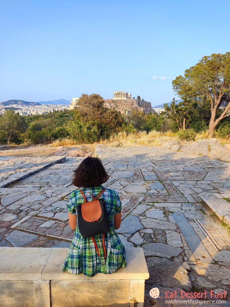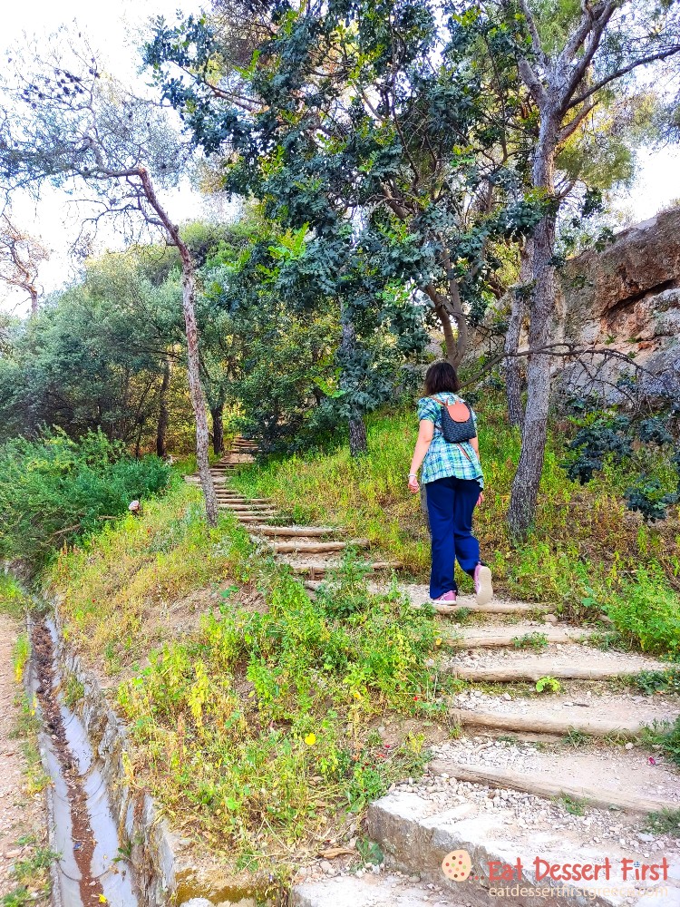 Από εκεί πήραμε ένα μονοπάτι που ανεβαίνει πάνω στον λόφο των Μουσών και φτάνει στο μνημείο του Φιλοπάππου. Το μονοπάτι αλλού έχει σκαλιά και αλλού ανηφορίζει. Είναι μια πολύ όμορφη διαδρομή, μέσα στη φύση, που μοιάζει σαν να μην είναι μέσα στην Αθήνα. Και η κατάληξή της σε αποζημιώνει πλήρως για τον μικρό κόπο που κατέβαλλες για να ανέβεις -η θέα στην πόλη και την Ακρόπολη είναι πραγματικά μοναδική!