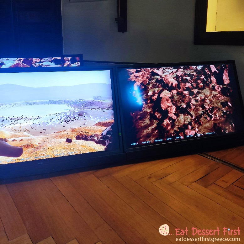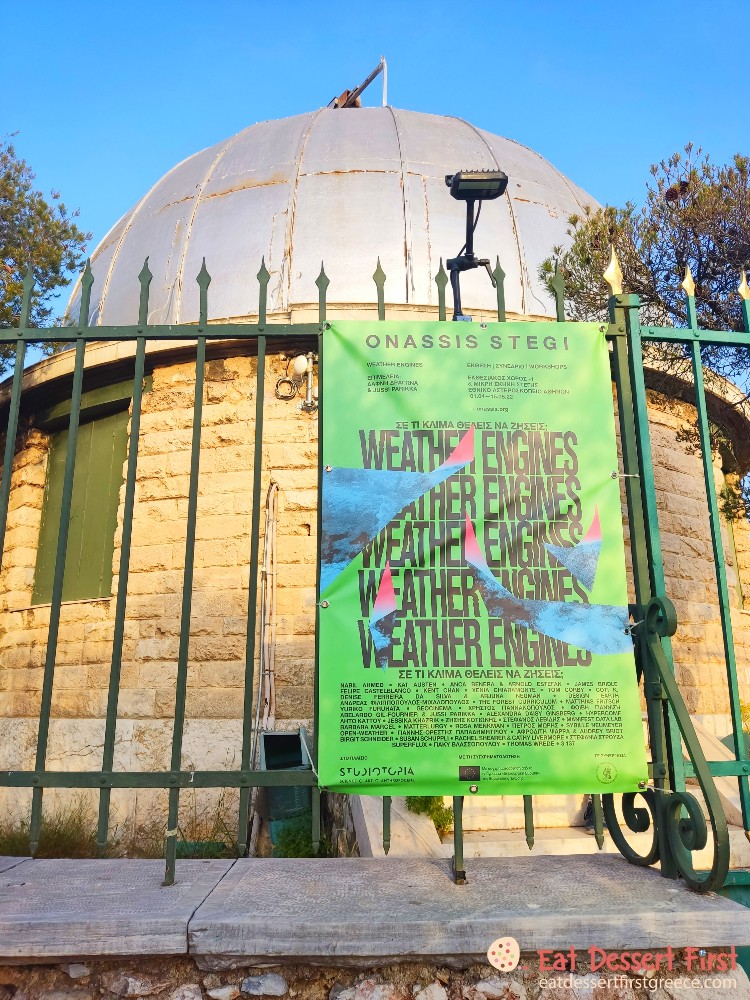 Την ημέρα εκείνη στους χώρους του Αστεροσκοπείου φιλοξενούνταν μια περιοδική έκθεση της Στέγης του Ιδρύματος Ωνάση με τίτλο “Weather Engines”. Όπως περιγράφεται στην ιστοσελίδα της έκθεσης, «εξερευνά την ποιητική, τις πολιτικές και τις τεχνολογίες του περιβάλλοντος, από τη γη ως τον ουρανό και από το χώμα ως την ατμόσφαιρα». Στον θόλο είδαμε οθόνες με αναπαραστάσεις της επιφάνειας του Άρη.