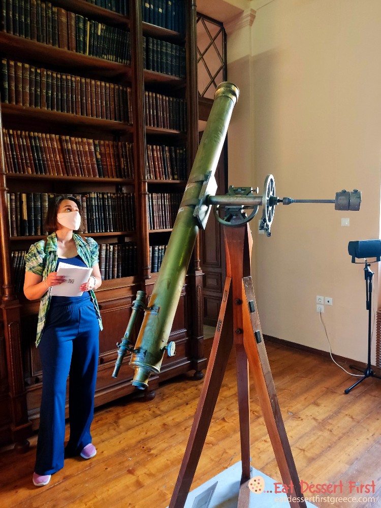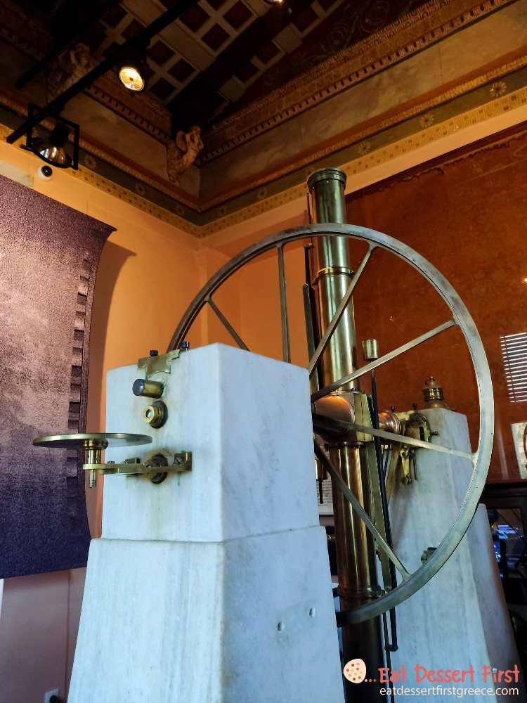 Φυσικά δεν χάσαμε την ευκαιρία να περιηγηθούμε στους χώρους του Αστεροσκοπείου. Είδαμε ιστορικά τηλεσκόπια, σπάνια βιβλία, παλιά επιστημονικά όργανα, μαζί με τα σύγχρονα έργα των συμμετεχόντων στην περιοδική έκθεση της Στέγης του Ιδρύματος Ωνάση που βρίσκονταν τοποθετημένα σε σημεία των χώρων. Μας έκανε μεγάλη εντύπωση και ένα αντίγραφο του περίφημου Μηχανισμού των Αντικυθήρων, ο οποίος θεωρείται ένα από τα πρώτα υπολογιστικά συστήματα!