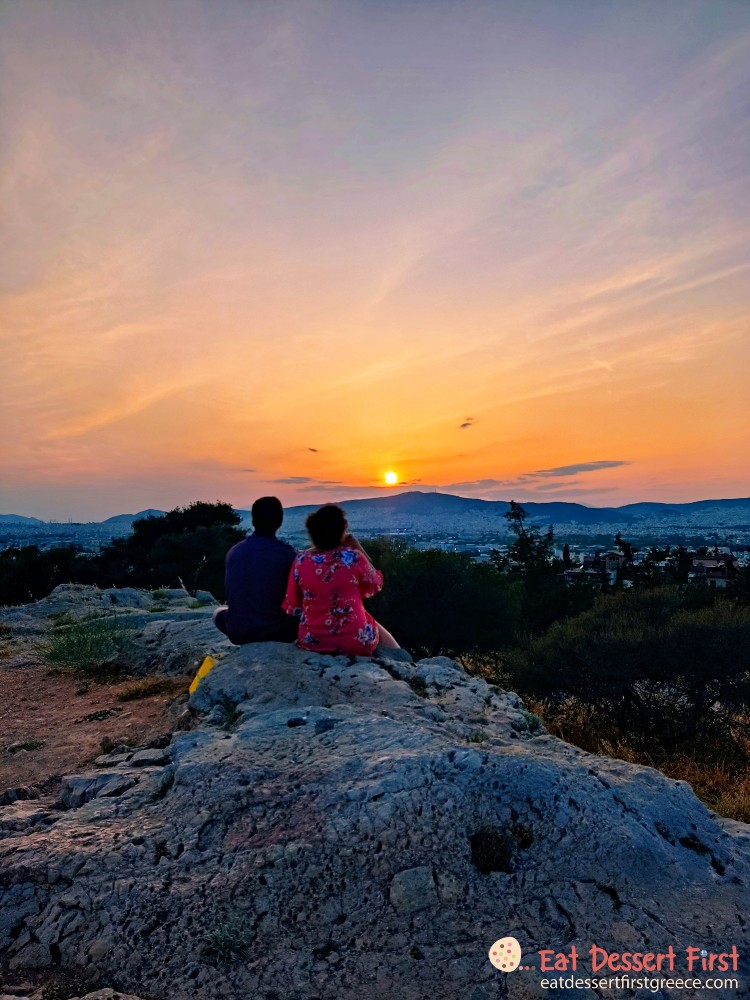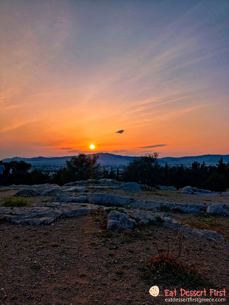 Όσο βρισκόμασταν μέσα στο Αστεροσκοπείο είχε αρχίσει να βραδιάζει. Αυτό που θα ολοκλήρωνε τέλεια τη μεγάλη μας βόλτα θα ήταν ένα όμορφο ηλιοβασίλεμα. Και το βρήκαμε περπατώντας λίγο πιο πέρα από το Αστεροσκοπείο, στο μέρος όπου βρισκόταν ένας αρχαίος δήμος της Αθήνας, ο Δήμος Μελίτης, ένας από τους πολυπληθέστερους δήμους της πόλης. Εκεί, όπως διαβάσαμε σε ενημερωτική πινακίδα, είχαν τις κατοικίες τους εξέχουσες προσωπικότητες, όπως ο Θεμιστοκλής, ο Μιλτιάδης, ο Κίμων, ο Αλκιβιάδης και άλλοι. Ένα μοναδικό σημείο από όπου μπορείς να δεις πανοραμικά ολόκληρη την πόλη, με το βλέμμα να φτάνει μέχρι τη θάλασσα. Πραγματικά υπέροχο!