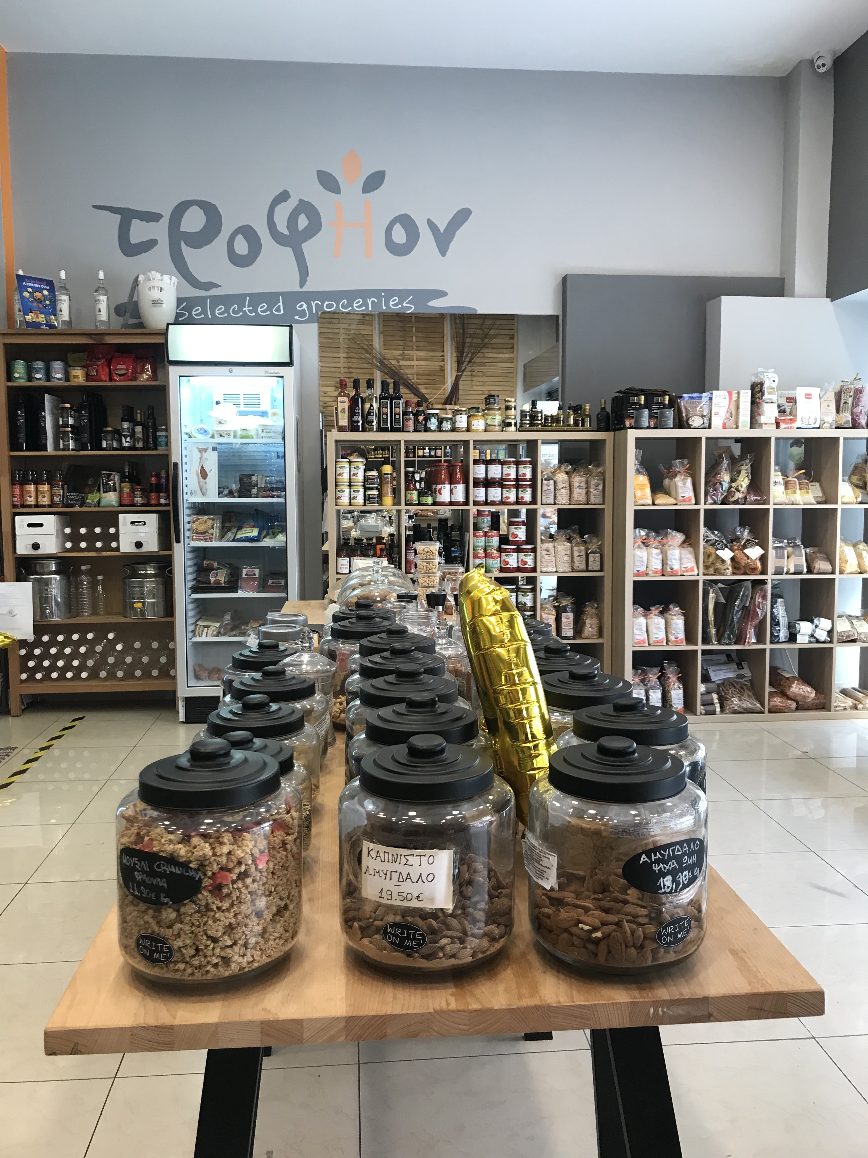 Το Τροφήον έχει έναν χαρακτήρα σύγχρονου παντοπωλείου, στο οποίο θα βρεις πάρα πολλά ελληνικά προϊόντα σχεδόν από όλη τη χώρα, από τη Θεσσαλονίκη μέχρι την Κρήτη, αλλά και κάποια Π.Ο.Π. τρόφιμα από το εξωτερικό, όπως η κινόα που δεν παράγεται στην Ελλάδα. Για να βρει τα προϊόντα του ο κ. Δημήτρης κάνει μεγάλη έρευνα και πάντα τα δοκιμάζει πριν τα βάλει στο ράφι. Γνωρίζει προσωπικά τους παραγωγούς και όσο μπορεί κάνει ταξίδια για να δει τις εγκαταστάσεις τους από κοντά. Στηρίζει κατά κύριο λόγο τα ελληνικά προϊόντα και τις μικρές οικογενειακές βιοτεχνίες, καθώς πιστεύει πως πρέπει να υπάρχει αλληλοϋποστήριξη ανάμεσα στις επιχειρήσεις.
