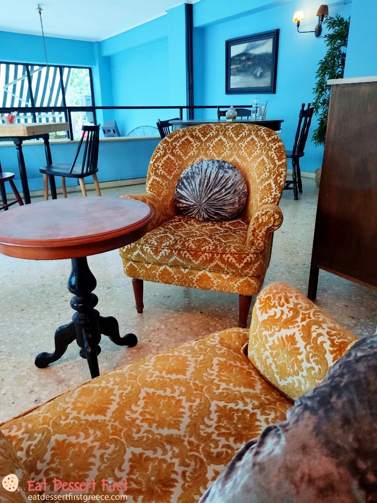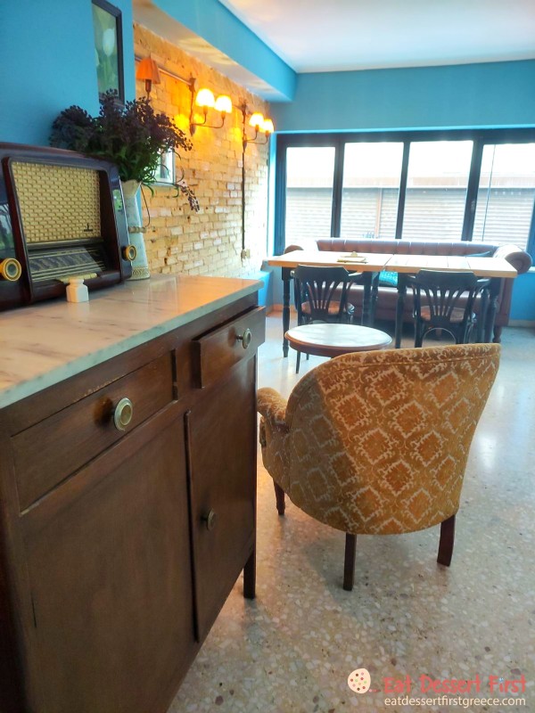 Με μια στρογγυλή σκάλα ανεβαίνεις στον πάνω όροφο. Το αγαπημένο μας σημείο είναι το τραπεζάκι με τις vintage υφασμάτινες πολυθρόνες, στο οποίο θα χαλαρώνουμε, θα τρώμε brunch και θα πίνουμε το ζεστό μας καφεδάκι τον χειμώνα…