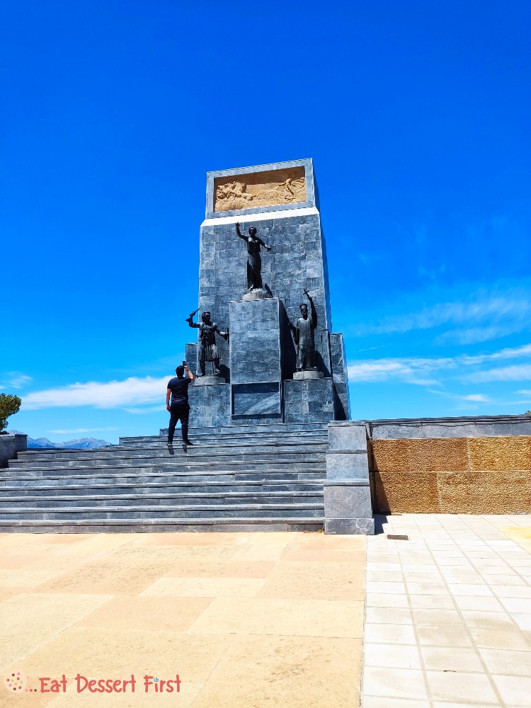 Φεύγοντας από την Ιερά Μονή Αγίας Λαύρας ανεβήκαμε με το αυτοκίνητο σε ένα ύψωμα όπου βρίσκεται το Πανελλήνιο Ηρώο Εθνικής Παλιγγενεσίας Αγωνιστών 1821. Πρόκειται για μια εντυπωσιακή γλυπτική σύνθεση, η οποία αποκαταστάθηκε το 2021 για τον εορτασμό των 200 χρόνων από την Επανάσταση. Αποτελείται από τρεις ανδριάντες που συμβολίζουν τη συμμετοχή του Κλήρου και των Αγωνιστών στον αγώνα, καθώς και την Ελευθερία του ελληνικού έθνους από τους Τούρκους κατακτητές. Το μνημείο έχει πολύ μεγάλη αξία, καθώς είναι το μοναδικό ηρώο για το 1821 πανελληνίως. Και η θέα από εκεί ψηλά είναι απίστευτη!