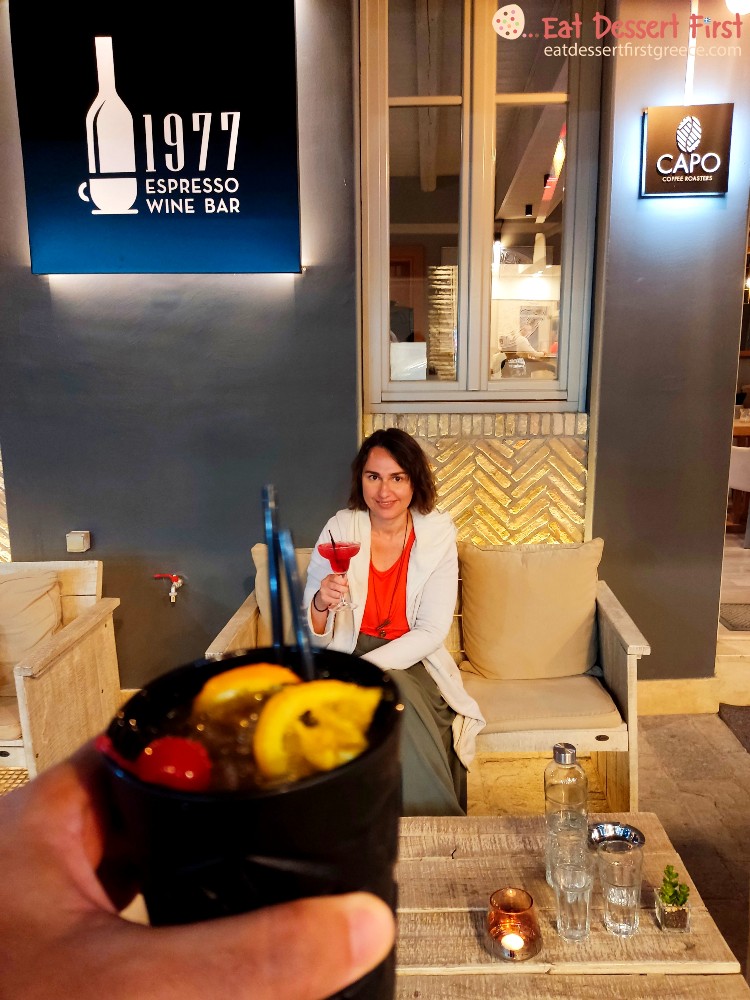 Καθίσαμε σε ένα εξωτερικό τραπεζάκι και γνωρίσαμε τη σύζυγο του ιδιοκτήτη κ. Γιώργου Κακιού, την κ. Γεωργία Αρχιμανδρίτη. Με τον σύζυγό της έχουν μια καφετέρια στην Πάτρα και εδώ και 2,5 μήνες το 1977 Espresso Wine Bar. Η κ. Γεωργία μας είπε πως αγαπάνε πολύ τον τόπο τους. Έβλεπαν τον χώρο που βρίσκεται σήμερα το μαγαζί τους ελεύθερο, οραματίστηκαν να ανοίξουν εκεί τη νέα τους επιχείρηση και το έκαναν πραγματικότητα με μεγάλη φροντίδα και αγάπη. Θέλουν να προσφέρουν καλό καφέ, κρασί και ποτό στον κόσμο, όποιος έρχεται να περνάει όμορφα. Όπως είδαμε, το μαγαζί τους έχει αγαπηθεί τόσο από τους ντόπιους όσο και από τους τουρίστες, και έχει πιστούς πελάτες από την πρώτη στιγμή που άνοιξε.
