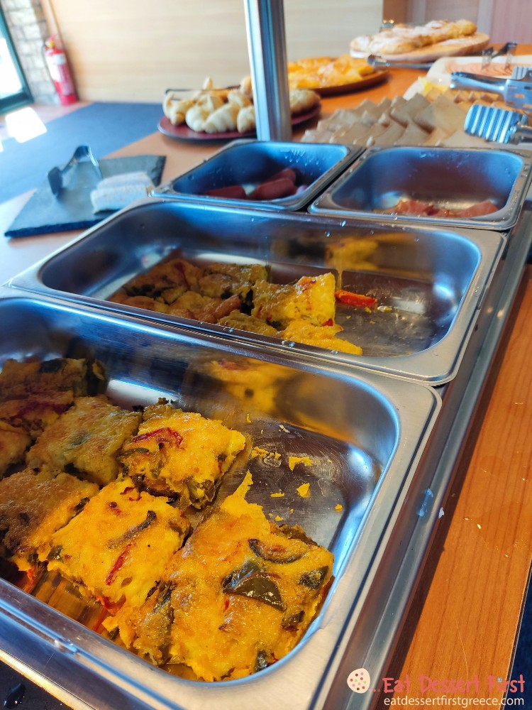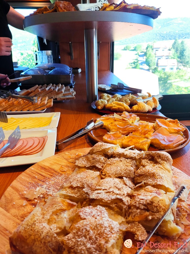Και τι δεν είχε ο μπουφές! Φρέσκο γάλα και γιαούρτι από τον Αγροτικό Γαλακτοκομικό Συνεταιρισμό Καλαβρύτων, χυμό πορτοκαλιού, καφέ, τσάι του βουνού, διάφορα δημητριακά, ομελέτα με λαχανικά, μπέικον, λουκάνικα, αραβική με γαλοπούλα, τυρί και μαγιονέζα, τοπικά αλλαντικά και τυριά, ψωμάκια που μπορούσες να φρυγανίσεις, τυρόπιτα με φέτα Καλαβρύτων που φτιάχνει η γιαγιά του Βασίλη του ιδιοκτήτη, γαλατόπιτα της μαμάς, μηλόπιτα της θείας, κέικ, μπουγάτσα, κρουασάν, πραλίνα