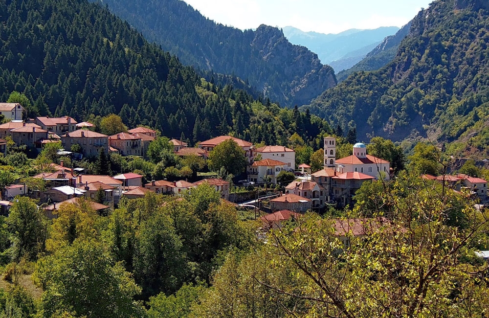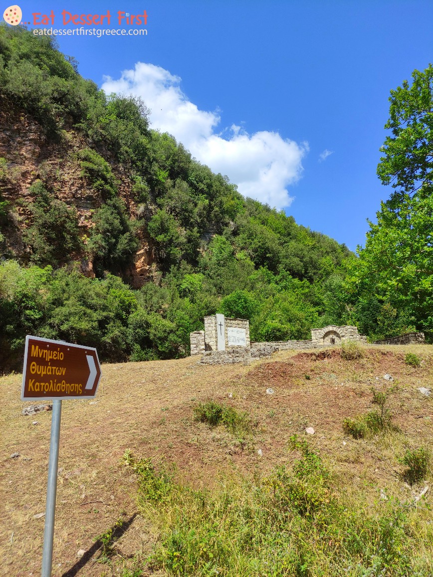 Βγαίνοντας από το δάσος, στην κορυφή της διαδρομής, η θέα είναι πανοραμική… Βλέπεις τα δάση παντού τριγύρω, τα βουνά της Ευρυτανίας, τα χωριά στο βάθος, και αναπνέεις πεντακάθαρο αέρα. Το Παλιό Μικρό Χωριό είναι πολύ κοντά, αρκεί να περπατήσεις για λίγα λεπτά στον ασφαλτοστρωμένο δρόμο. Μια στάση αξίζει το Μνημείο Θυμάτων Κατολίσθησης, ένα μνημείο για τους 13 κατοίκους του χωριού που χάθηκαν στην κατολίσθηση του 1963.