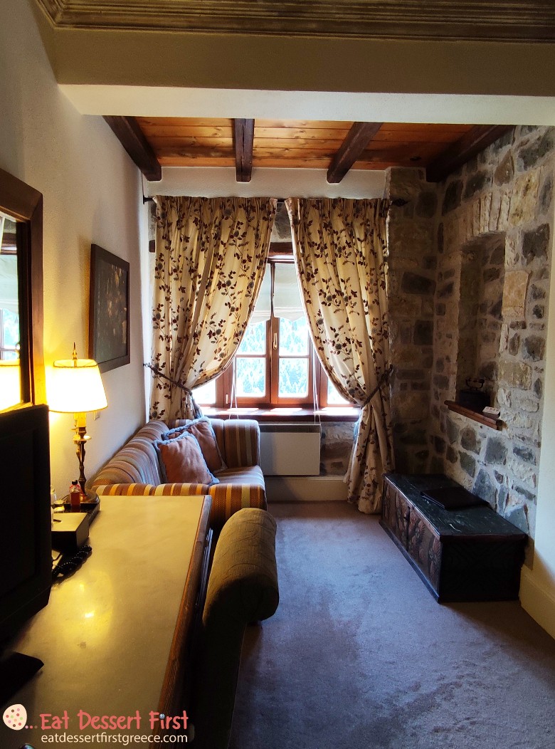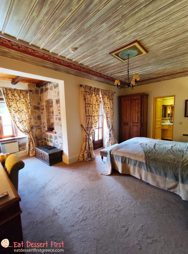 Μπαίνοντας στο δωμάτιό μας η αίσθηση οικειότητας και ηρεμίας έγινε ακόμα πιο έντονη. Ήταν ευρύχωρο, φωτεινό, διακοσμημένο με ένα πολυτελές και ταυτόχρονα παραδοσιακό στιλ, με ένα εντυπωσιακό ξύλινο ταβάνι με χρωματιστές λεπτομέρειες ζωγραφισμένες στο χέρι.