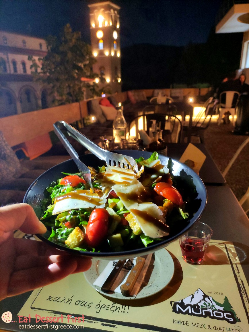 Περπατήσαμε για αρκετή ώρα, οπότε μας άξιζαν μερικά τοπικά μεζεδάκια, έτσι δεν είναι; Θέλαμε πολύ να δοκιμάσουμε τις γαστρονομικές προτάσεις στο μεζεδοπωλείο Μύλος, ένα νέο μαγαζί στο νότιο και χαμηλότερο μέρος του Καρπενησίου, δίπλα στον Ιερό Ναό Ευρυτάνων Αγίων.