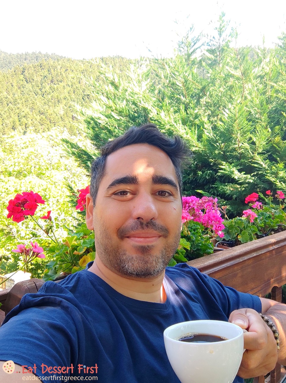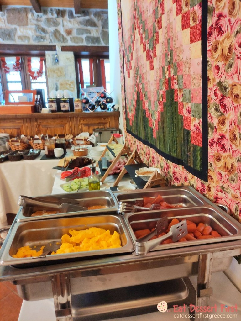 Ο ύπνος ήταν με μια λέξη απολαυστικός -μάλιστα ήταν τόσο δροσερά που σκεπαστήκαμε με το πάπλωμα. Το πρωί ξυπνήσαμε ανυπομονώντας να δοκιμάσουμε το σπιτικό πρωινό του. Ένας πλούσιος μπουφές μας περίμενε στην τραπεζαρία με ένα σωρό λιχουδιές: ομελέτα με φρέσκα αυγά, λουκάνικα, μπέικον, ντόπια πίτα, βραστά αυγουλάκια, τυριά, αλλαντικά, υλικά για σαλάτα με ντομάτα, αγγούρι, ελιά, ελαιόλαδο και ρίγανη, χειροποίητο ρυζόγαλο με κανέλα, κέικ σοκολάτα και βανίλια, ντόπιο γιαούρτι, μέλι από παραγωγό της περιοχής, μαρμελάδες, μούσλι, πολλά διαφορετικά ψωμάκια και κριτσίνια, καφέ και χυμό λεμόνι και πορτοκάλι. Φυσικά βάλαμε από όλα!