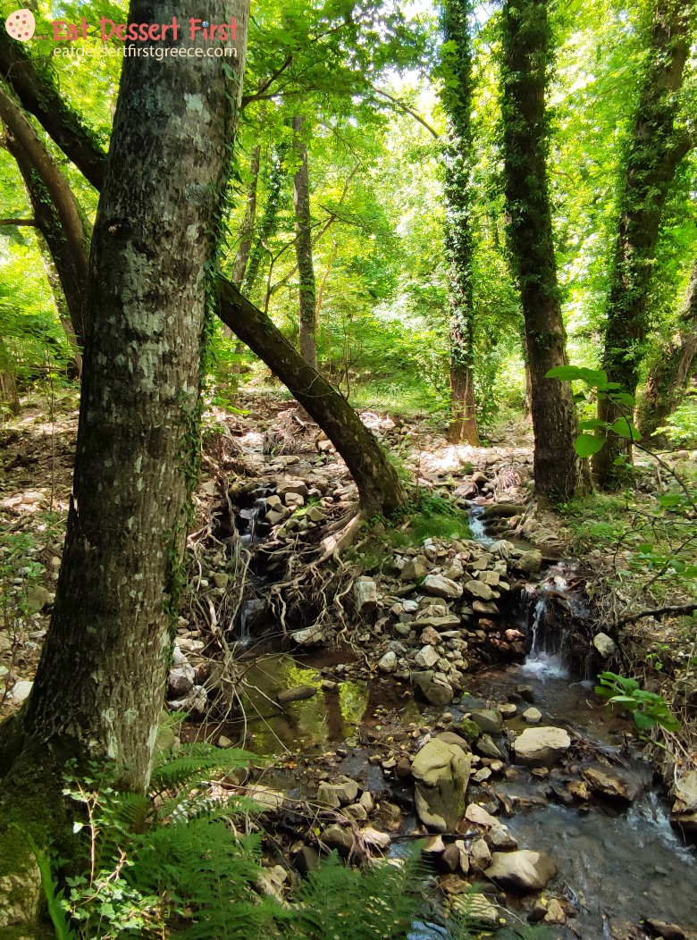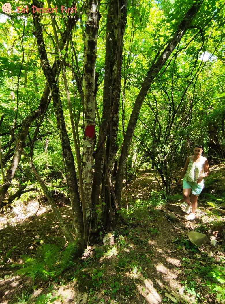 Μετά το χωριό μπαίνουμε στο δασικό μονοπάτι, μέσα στην πυκνή βλάστηση. Για περίπου 40 λεπτά περπατήσαμε ανάμεσα σε ψηλά, καταπράσινα δέντρα ακολουθώντας τα κόκκινα τετράγωνα που σηματοδοτούν το πεζοπορικό μονοπάτι. Είναι πραγματικά μια εύκολη διαδρομή, την οποία αξίζει να κάνεις μιας και περνάς μέσα από τα υπέροχα δάση, αλλά και από τα όμορφα χωριά της περιοχής.