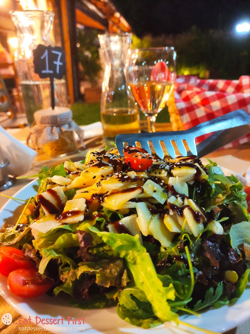 Οι επιλογές στον κατάλογο ήταν πάρα πολλές: ορεκτικά, τοπικά τυριά, φρέσκιες σαλάτες, χωριάτικες πίτες, μεζέδες για τη μέση, σούπες, λαδερά, μαγειρευτά πιάτα με ντόπια κρέατα, κρεατικά της ώρας, σούβλες, ποτά και χειροποίητα παραδοσιακά γλυκά. Όλα φτιάχνονται με προϊόντα του τόπου τους, με παραδοσιακές συνταγές και πολλή αγάπη! Ήταν πολύ δύσκολο να διαλέξουμε, μιας και θέλαμε να δοκιμάσουμε από όλα, αλλά τελικά καταλήξαμε στη δική τους σαλάτα «Αγρού», στην ντόπια φέτα τυλιγμένη σε φύλλο, σε ένα μαγειρευτό πιάτο – το πάντα αγαπημένο κοκκινιστό μοσχαράκι και σε ένα πιάτο της ώρας, μπριζολοπανσέτα στη σχάρα. Ήταν όλα πεντανόστιμα!