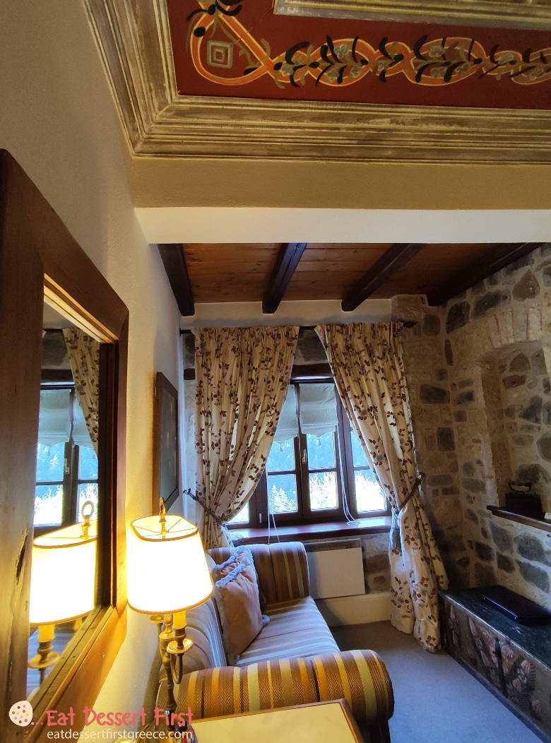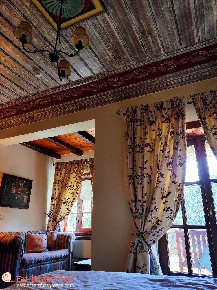 Ξυπνήσαμε λοιπόν άλλη μια ηλιόλουστη μέρα, έχοντας κάνει έναν ήρεμο και δροσερό ύπνο στο μαλακό κρεβάτι του δωματίου μας. Οι εσωτερικοί χώροι του ξενοδοχείου είναι πολύ προσεγμένοι, διακοσμημένοι με ξύλο, πέτρα και παραδοσιακά στοιχεία, έχοντας ταυτόχρονα όλες τις σύγχρονες ανέσεις και με το παραπάνω. Αγαπημένο μας σημείο του δωματίου ήταν το κρεβάτι με τη μπαλκονόπορτα απέναντι, μέσα από την οποία έβλεπες τα καταπράσινα, γεμάτα έλατα βουνά που περιβάλλουν το ξενοδοχείο!