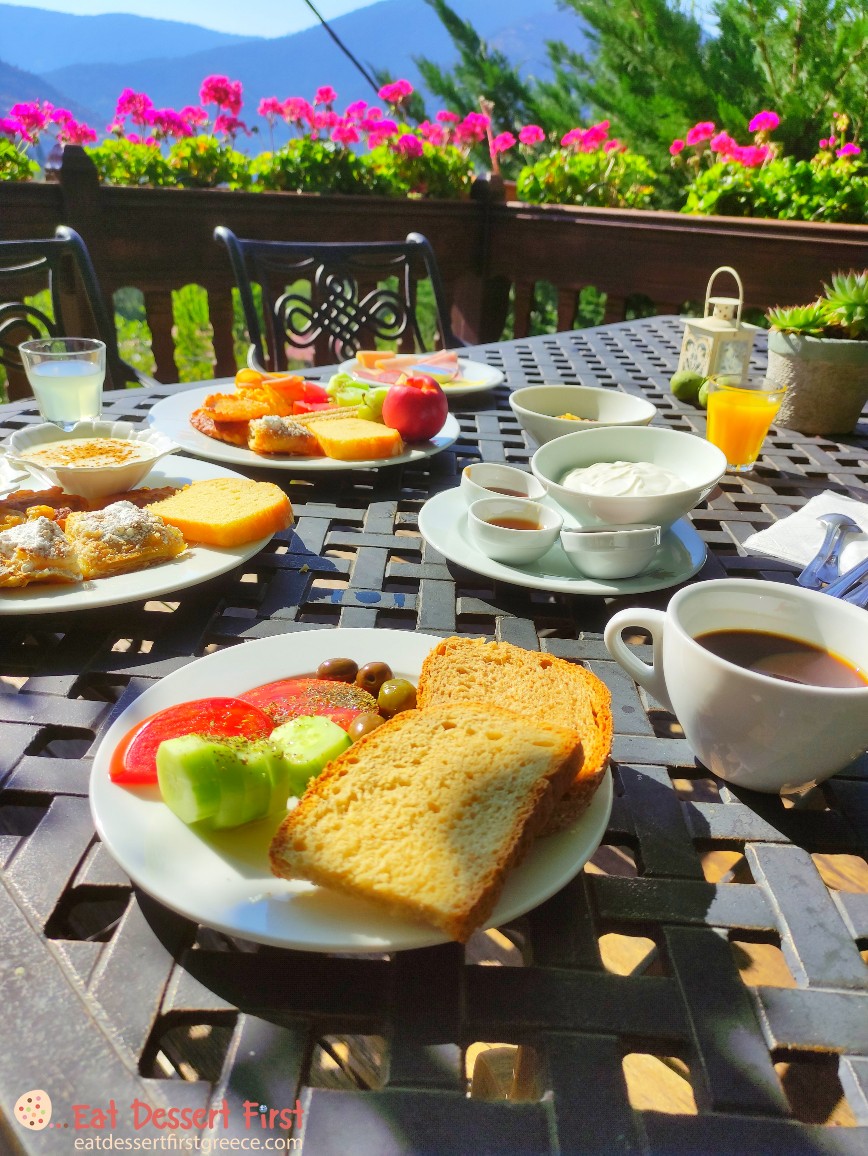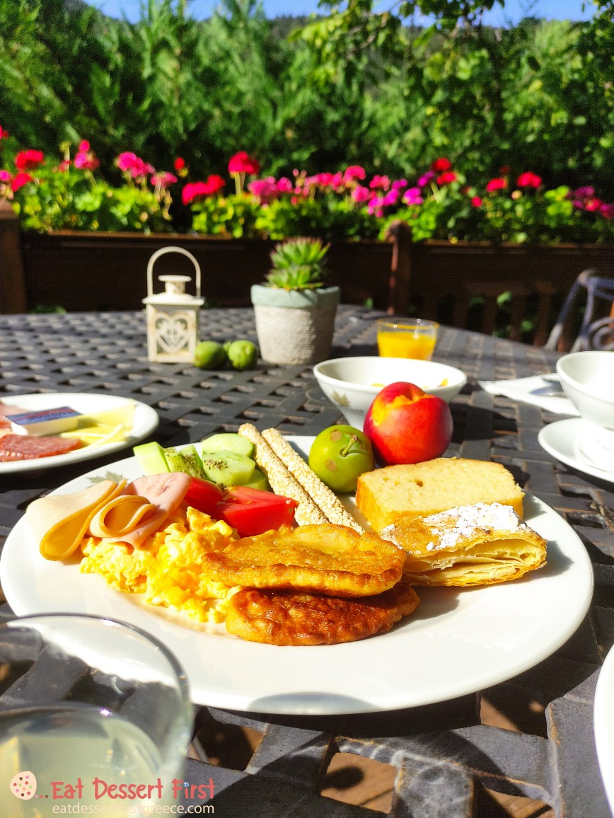 Το πρωινό είναι φτιαγμένο με φρέσκα, τοπικά προϊόντα, λαχανικά, αλλαντικά, γαλακτοκομικά της περιοχής. Ντόπιο γιαούρτι με σπιτικές μαρμελάδες και μέλι της περιοχής, σαλάτα με ζουμερή ντομάτα και αγγουράκι, ζυμωτό ψωμάκι, χειροποίητες τηγανήτες με κολοκυθοανθούς και τυρί, scrambled eggs, φρέσκα εποχιακά φρούτα και για γλυκάκι ρυζόγαλο, κέικ και μπουγάτσα, μαζί με καφεδάκι και χυμό ήταν οι επιλογές μας από τον πλούσιο μπουφέ. Τα ξαναθυμόμαστε και τα λιγουρευόμαστε όλα!