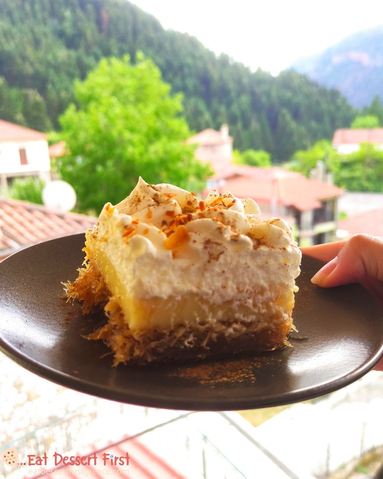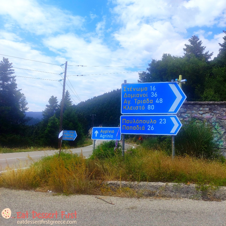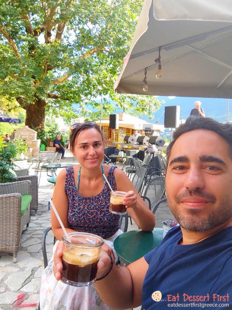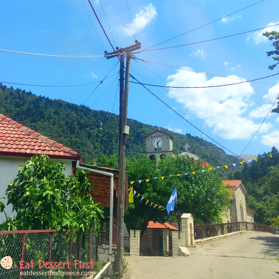 Ένα από τα πιο όμορφα σημεία του χωριού είναι η πλατεία του με μια φοβερή θέα προς την κοιλάδα του ποταμού Καρπενησιώτη και τις κορυφές του όρους Χελιδώνα. Στην πλατεία υπάρχουν πολύ ωραία μαγαζιά για καφέ, γλυκό και φαγητό. Διαλέξαμε αυτή τη φορά να πιούμε καφεδάκι και να δοκιμάσουμε παραδοσιακά γλυκά στο Γαλακτομπούρεκο του Καρβέλη. Πρόκειται για ένα μαγαζί που έχει γίνει σημείο αναφοράς στην περιοχή για το γαλακτομπούρεκό του, οπότε έπρεπε οπωσδήποτε να το δοκιμάσουμε!