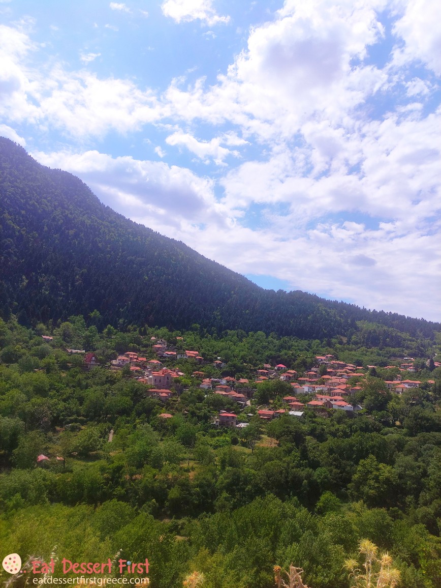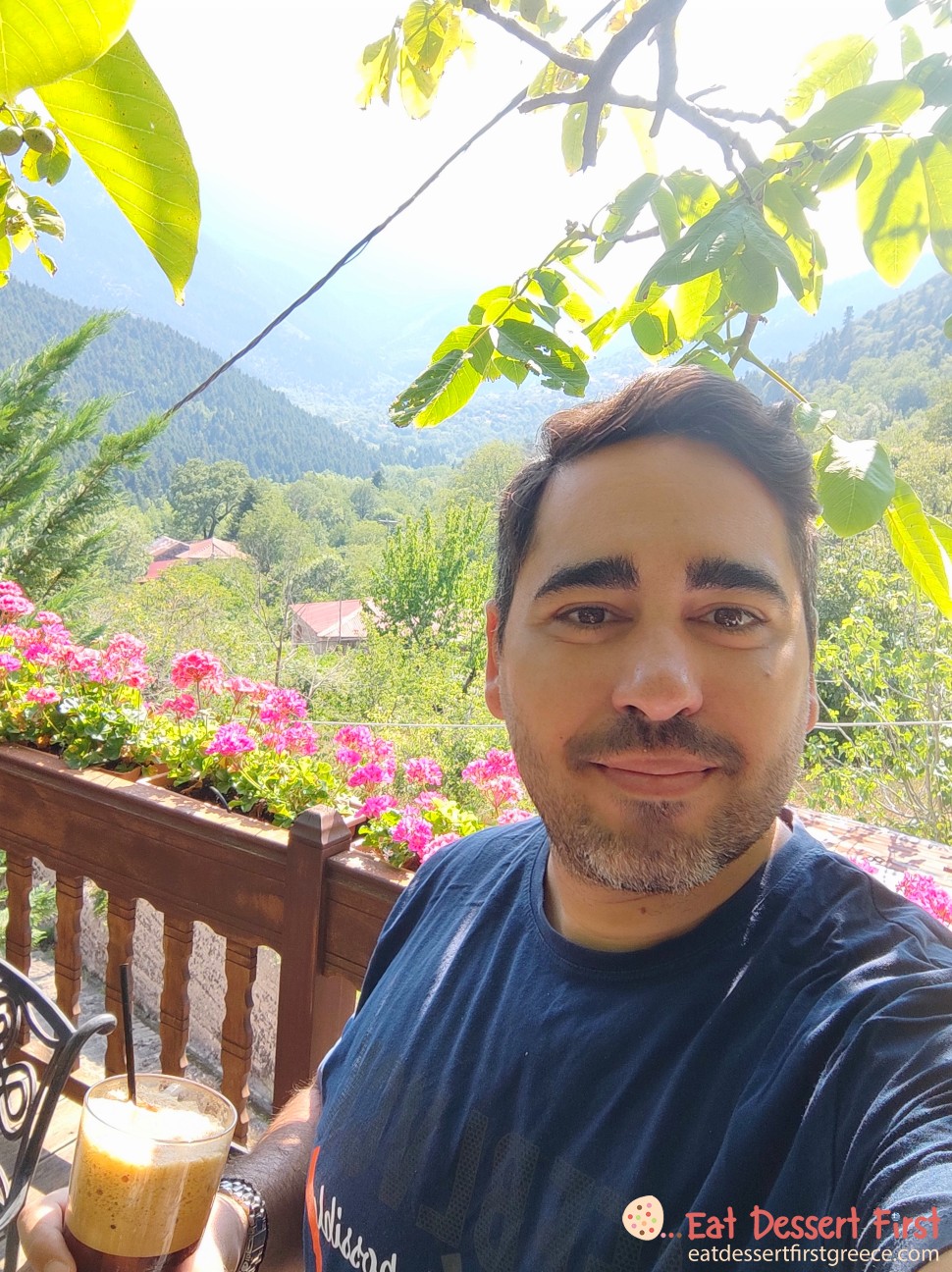 Οι επιλογές μας ήταν δύο: να καθίσουμε στο φημισμένο Γαλακτομπούρεκο του Καρβέλη, με ιστορία από το 1981 ή στον νέο χώρο του εγγονού της οικογένειας Θανάση, το Ρακόμελο. Το Ρακόμελο έχει μια πολύ ζεστή εσωτερική αίθουσα με μια μεγάλη τζαμαρία με απέραντη θέα, όπως και μια υπέροχη αυλή πάνω στην πλατεία, με φόντα τα καταπράσινα βουνά. Καθίσαμε εκεί και από το τραπέζι μας βλέπαμε τη φύση και τα πέτρινα σπιτάκια του χωριού με τις κεραμοσκεπές τους, ένα ονειρικό σκηνικό για χαλάρωση με το καφεδάκι μας.