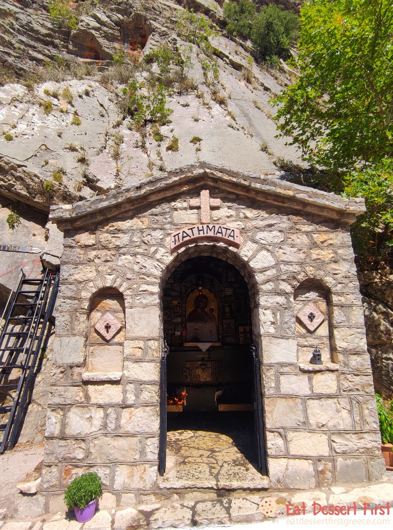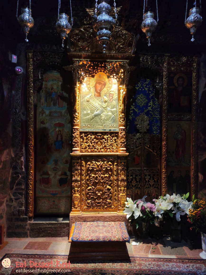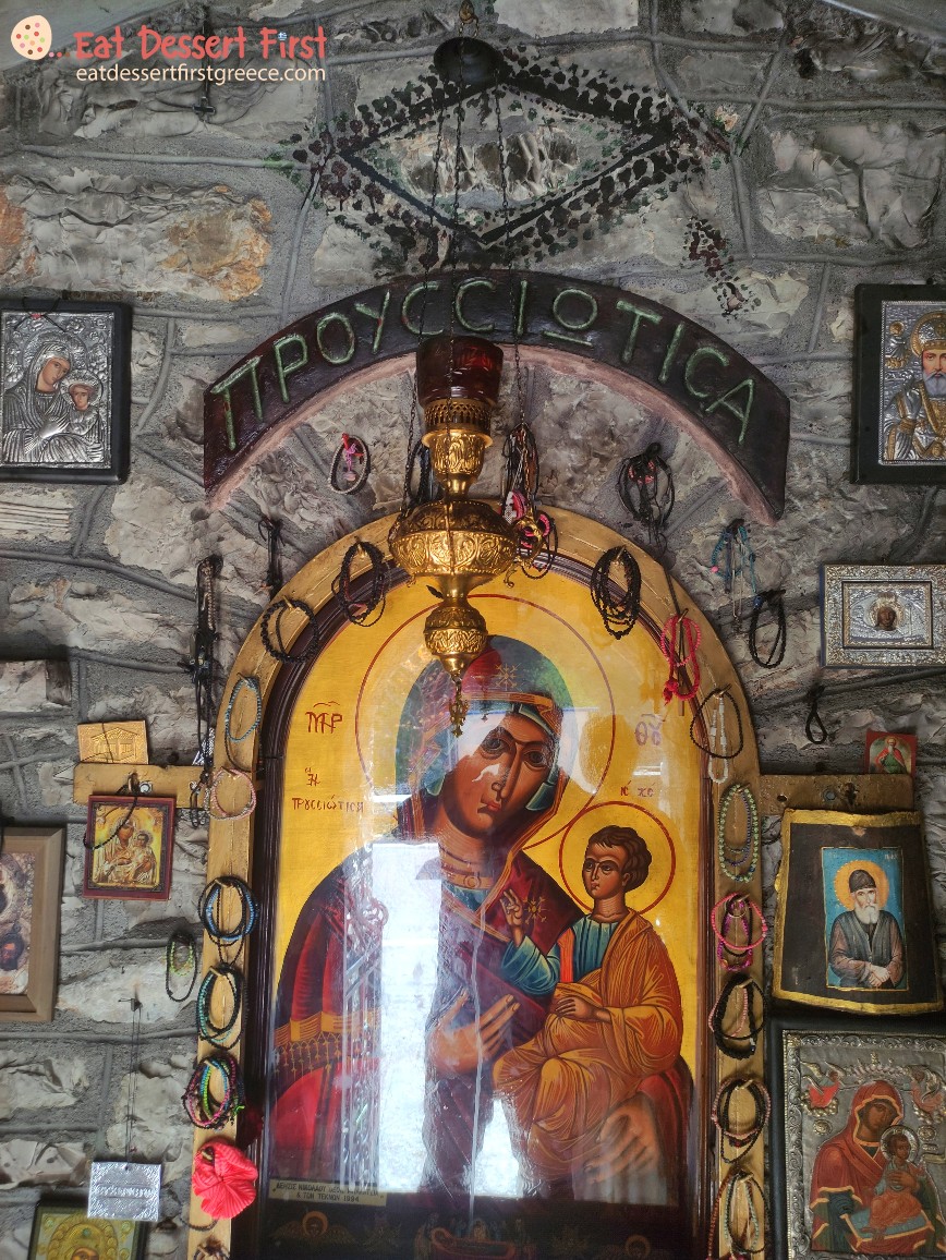 Στο εικονοστάσι και γύρω από το πάτημα πάρα πολλοί πιστοί αφήνουν κομποσχοίνια και τάματα. Αφήσαμε κι εμείς ένα μικρό σταυρουδάκι και αυτό που ζητήσαμε από την Παναγία μας, μας το έδωσε πολύ σύντομα…