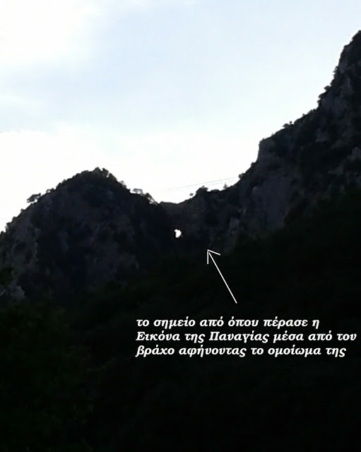 Στην Ευρυτανία ένας νεαρός βοσκός άκουσε ύμνους και είδε μια φωτεινή δέσμη στον ουρανό, η οποία τον οδήγησε στην εικόνα της Παναγίας. Η εικόνα επιστράφηκε στο αρχοντόπουλο, αλλά και πάλι εξαφανίστηκε. Το αρχοντόπουλο άκουσε μια γυναικεία φωνή να λέει πως αναπαύεται καλύτερα στον τόπο αυτό, και τότε δημιουργήθηκαν οι εσοχές στο βράχο που μοιάζουν με πατήματα και η τρύπα στην κορυφή του βουνού στο μέγεθος της εικόνας. Η εικόνα βρίσκεται σήμερα στη Μονή Προυσού.